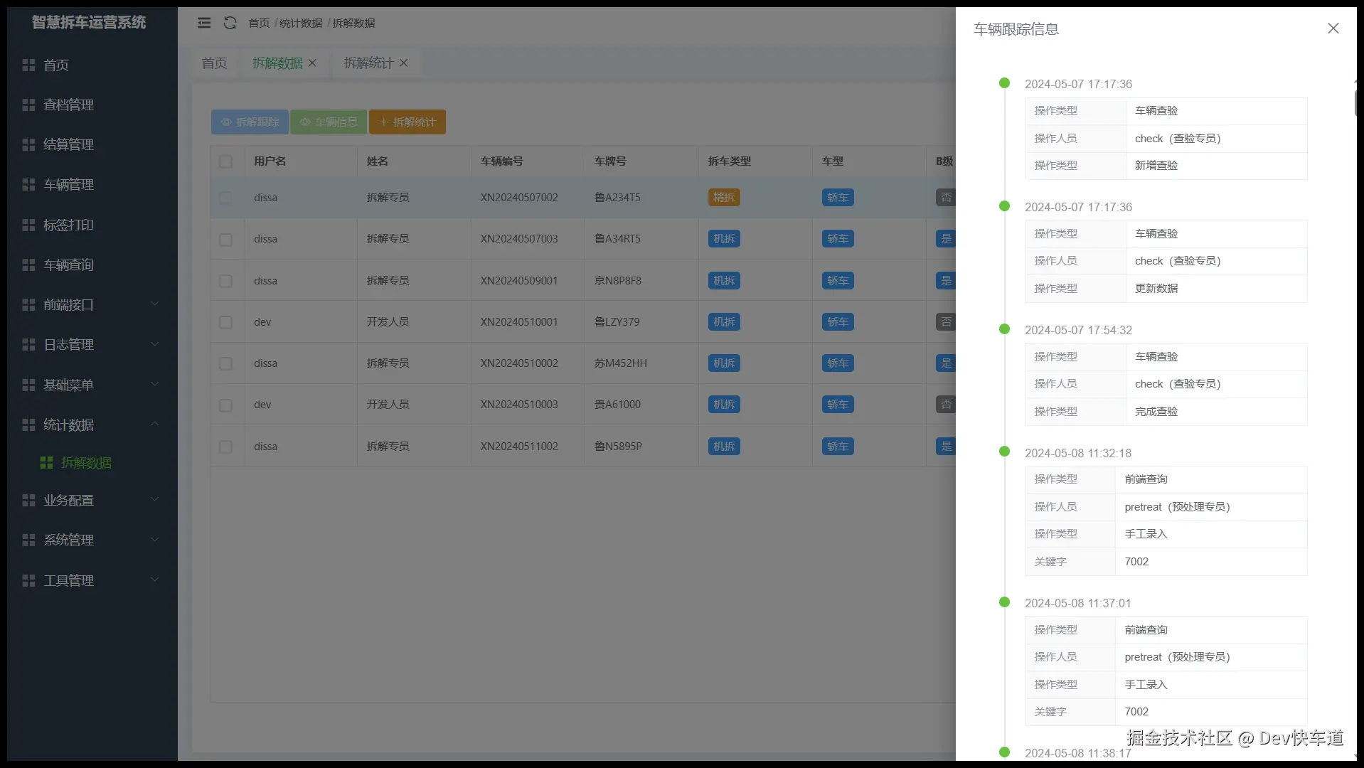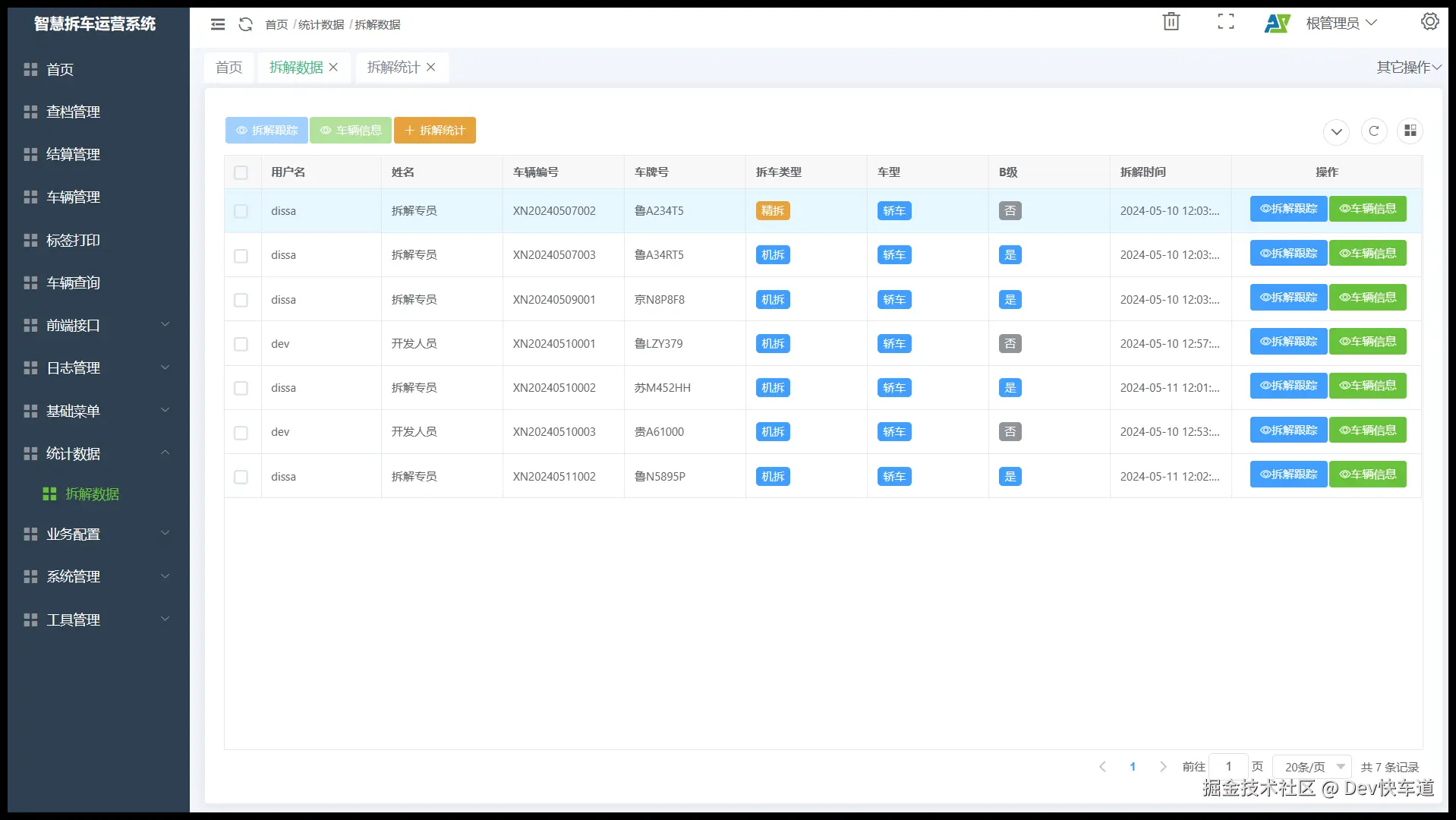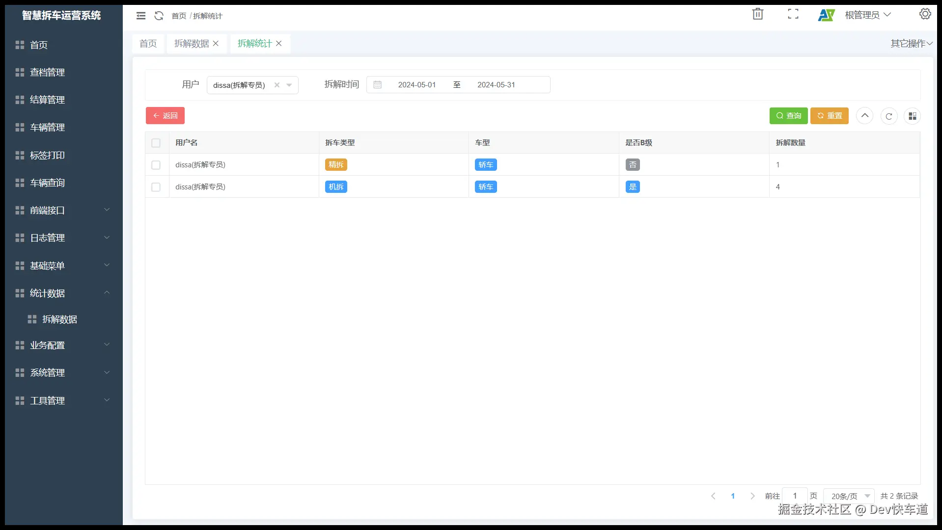 统计数据-拆解数据菜单是用于全面了解车辆拆解岗位的拆解车辆的数据统计和了解车辆在进场到完成拆解的全生命 周期中每个工作环节的具体情况;