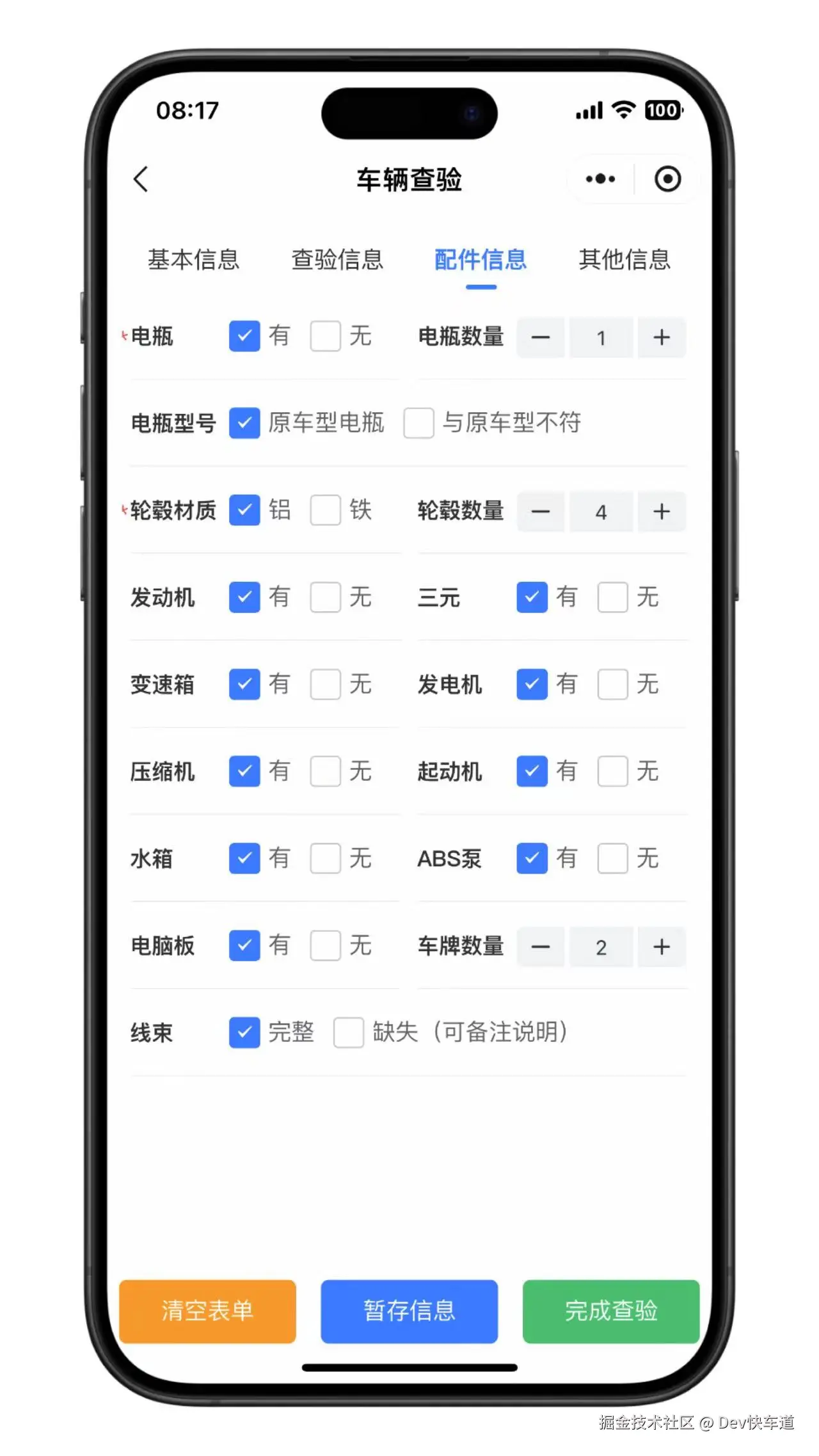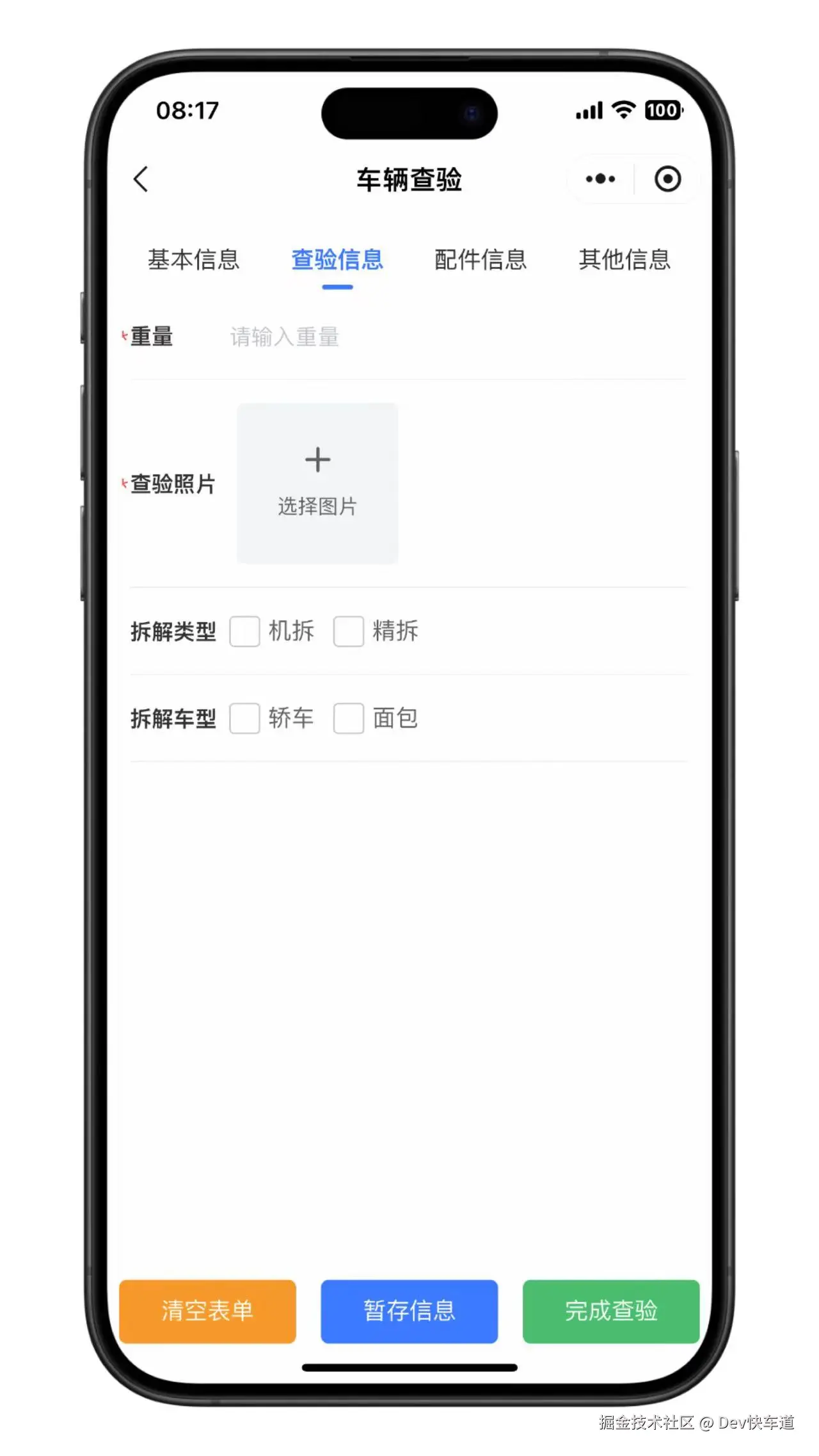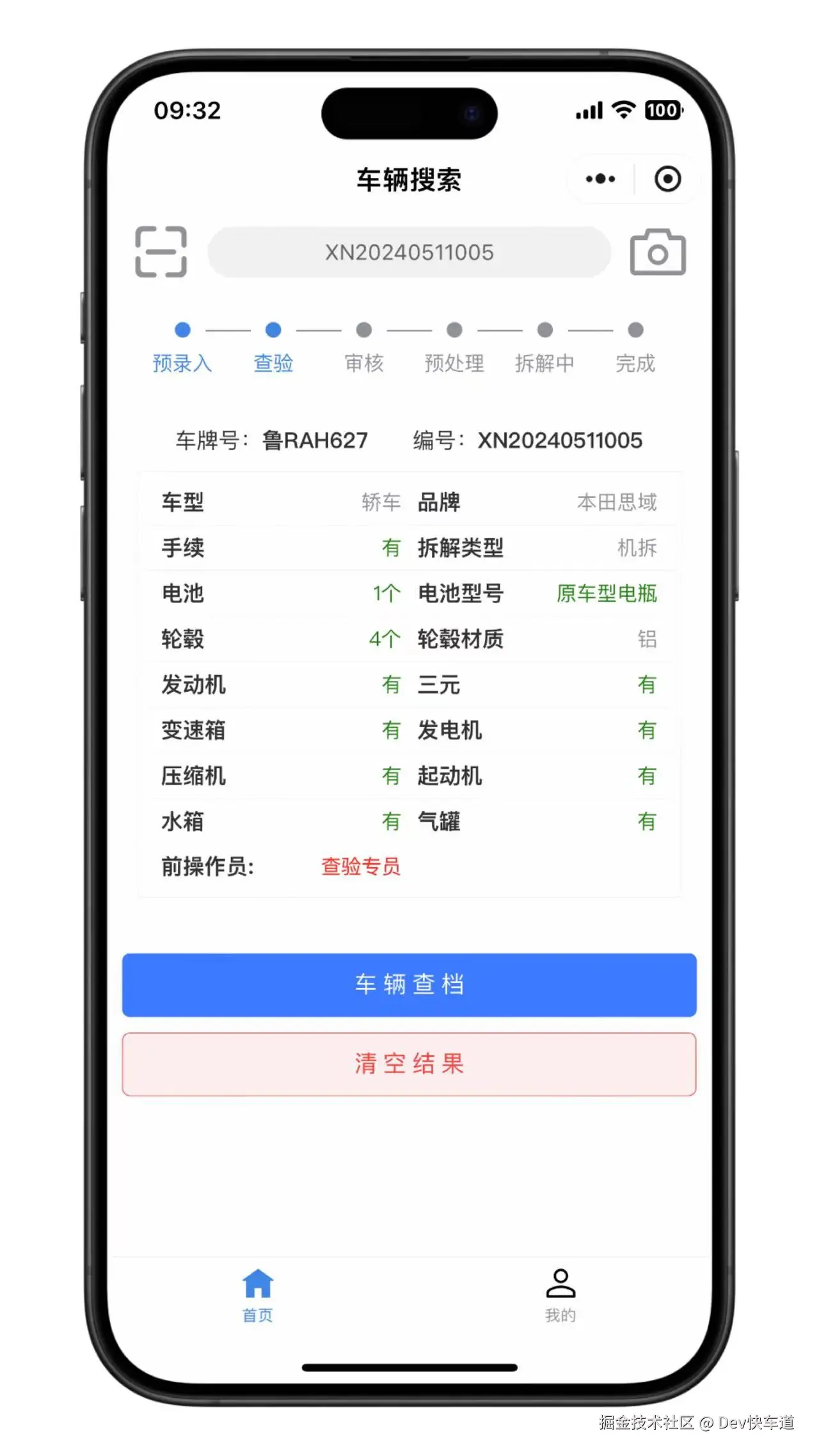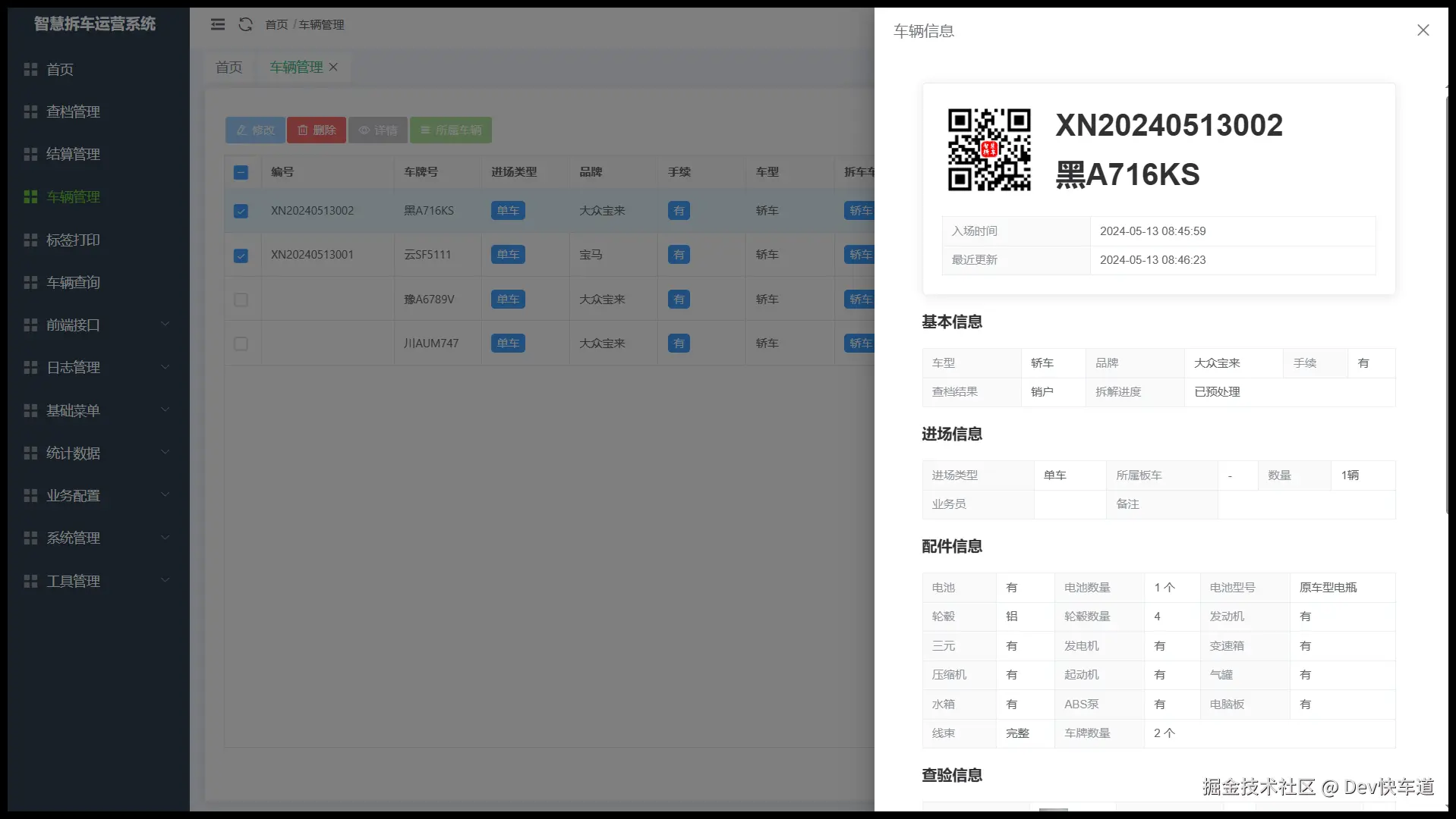 合作伙伴将车辆运输到拆解厂后,由车辆查验人员进行车辆查验;查验信息如下图所示: