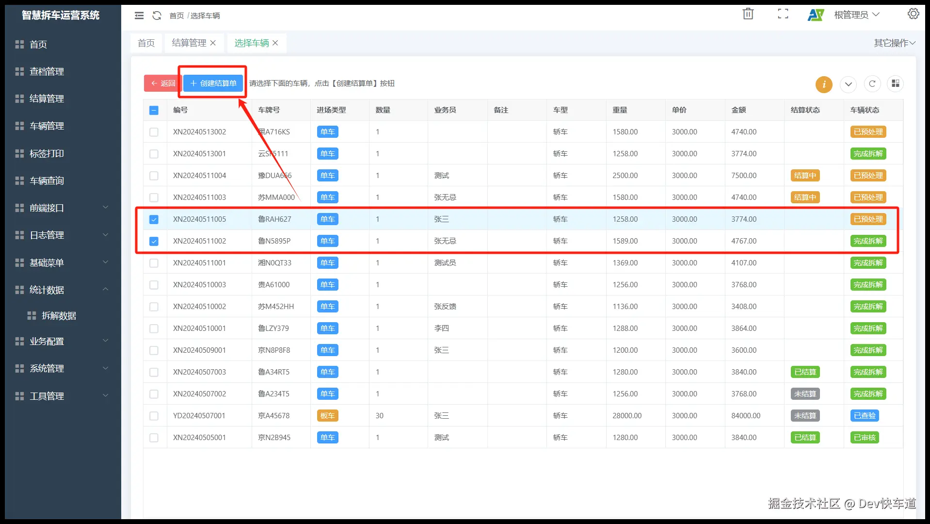 在选择车辆界面中,点选需要在同一张结算单上结算的车辆,点击创建结算单按钮,系统提示加入结算单的车辆,不可以再次加入其他 结算单,需要删除结算单才可以重新结算;
