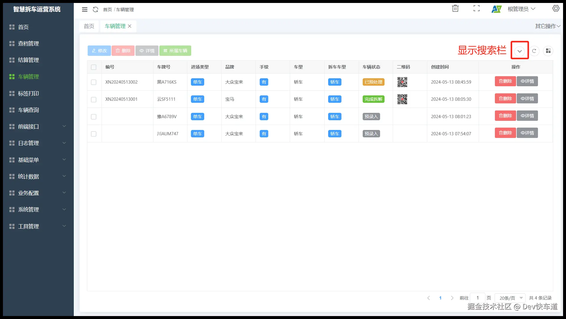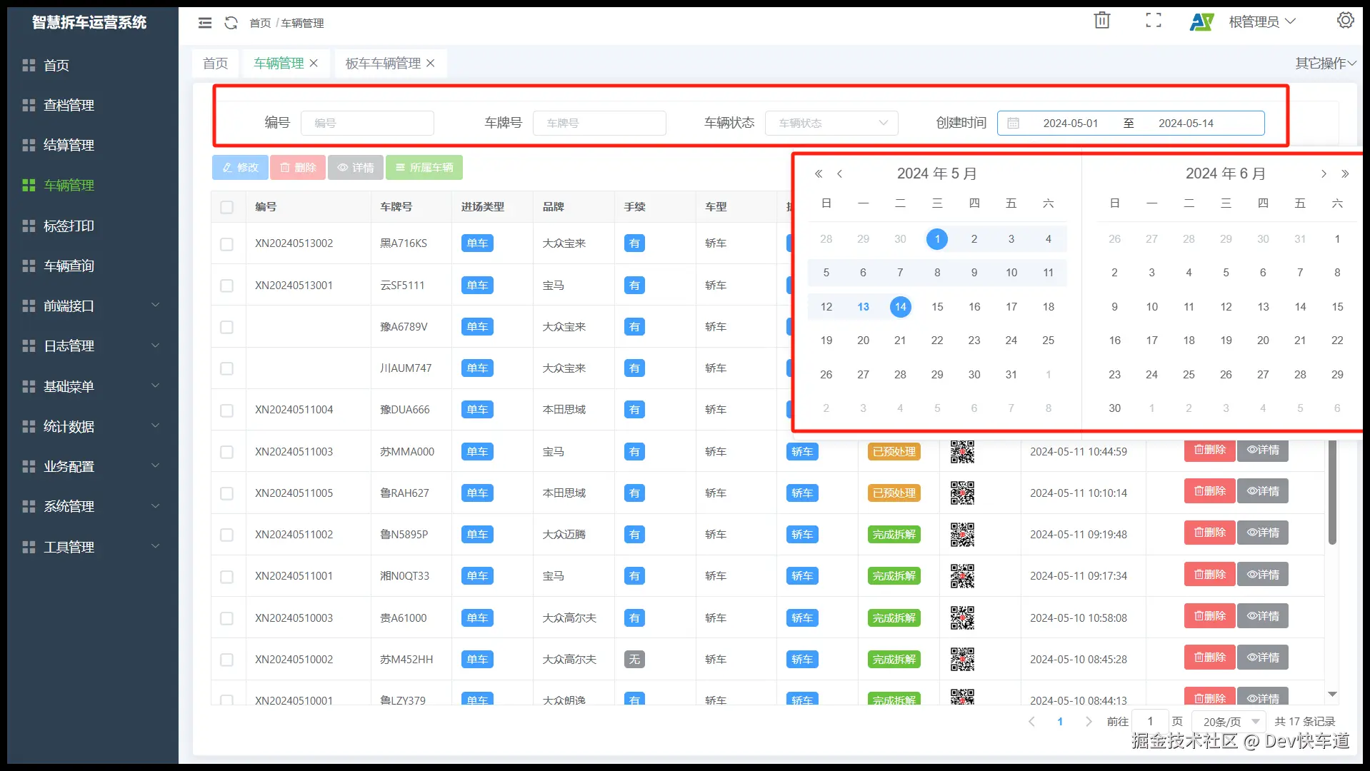 打开菜单显示的是当天的所有拆解的车辆的信息列表,如果需要查询其他时间,请打开查询栏设置查询条件;如下图所示:
