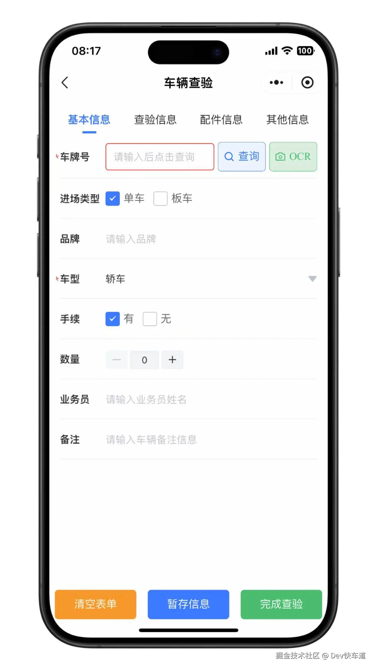 - 车辆查验人员:录入车辆信息,查验车辆配件