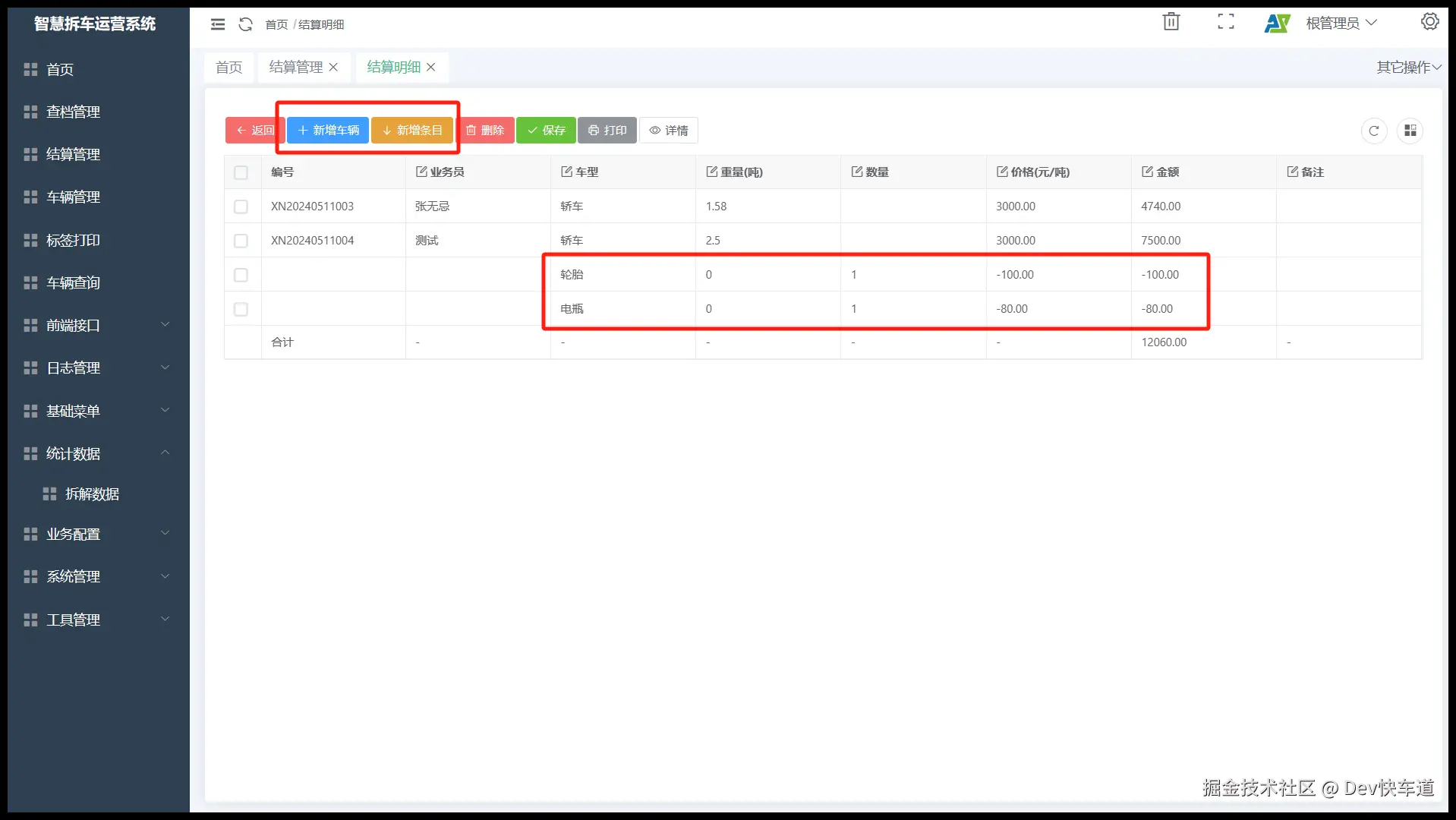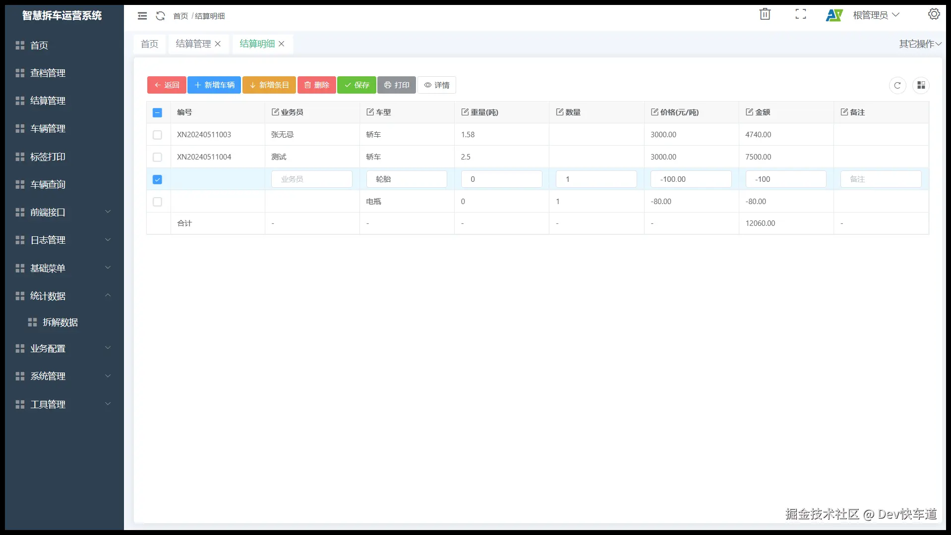 回到结算单界面,点击管理详情按钮,可以对结算单的每一行数据进行定义,默认情况下,系统会根据车辆重量和车型等信息,自动 推荐价格和合计金额,如果需要进行修改,可以单击行,进行编辑;也可以增加新的车辆或者新的条目;