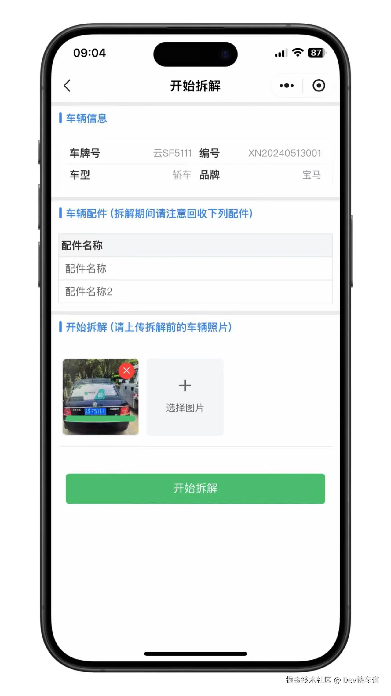 在车辆完成预处理操作后,车辆拆解人员就可以对车辆进行拆解了,车辆拆解在这里我们分为两个阶段。 首先是开始拆解,需要拆解人员对拆解前的车辆进行拍照,具体要求由管理人员明确要求; 其次就是完成拆解,需要拆解人员对拆解完成后的相关现场进行拍照上传;以备后续质检人员进行质检;