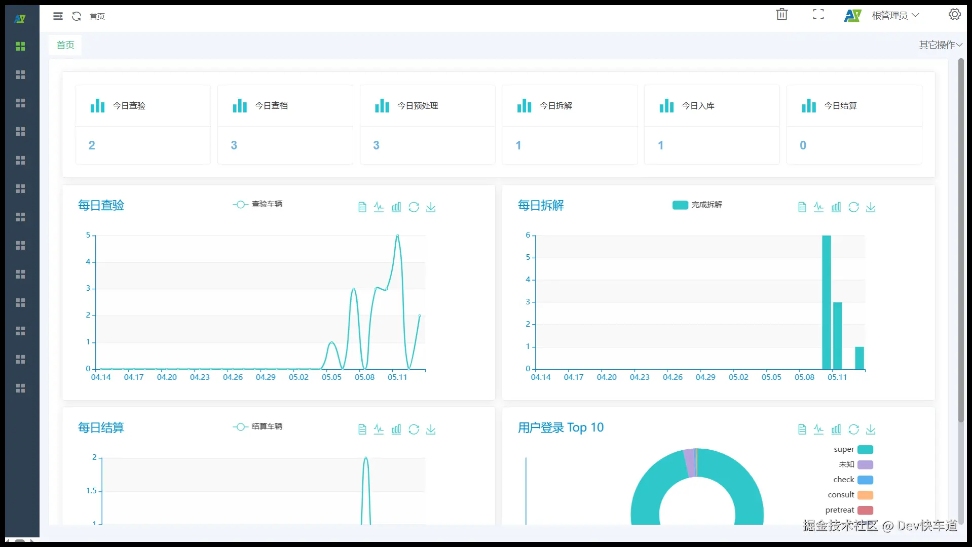 主要统计查验、查档、预处理、拆解、入库、结算等数据,对于近一个月的查验、拆解和结算信息是通过图表的形式展示在首页;