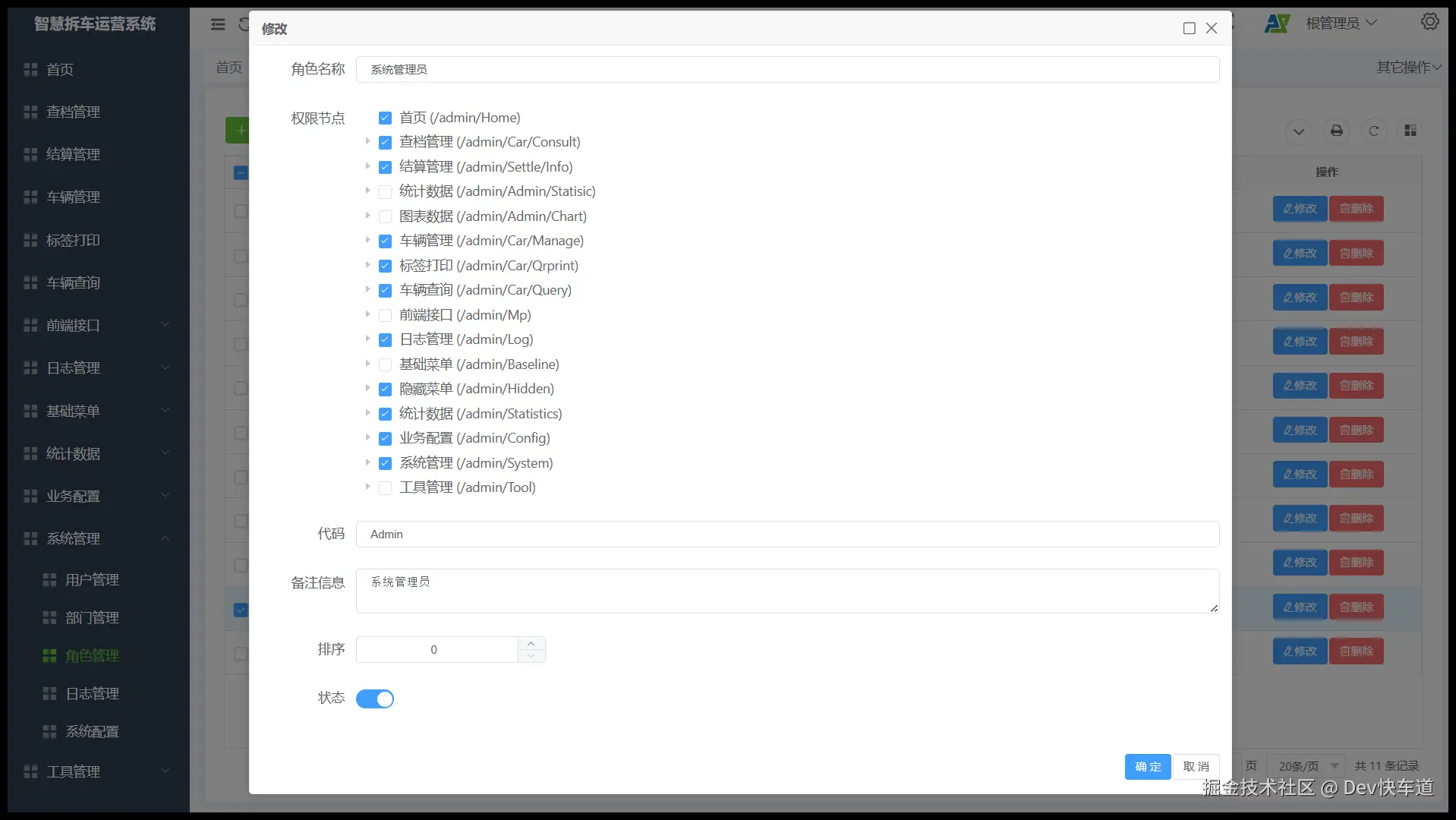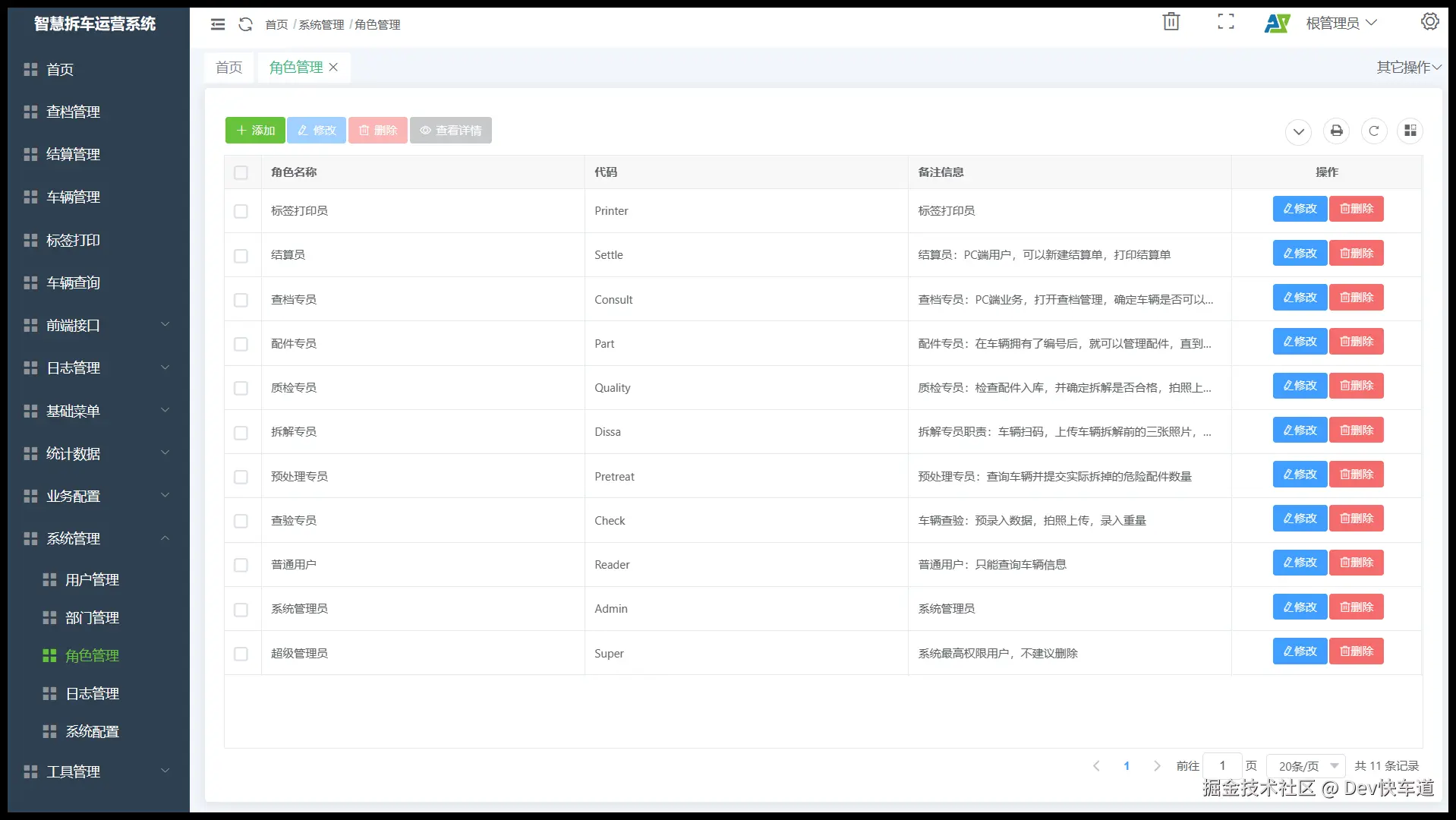 在我们的业务系统中,默认是创建了多个默认角色,例如系统管理员,查验专员,预处理专员,拆解专员等;您可以通过角色管理中 的编辑角色了解他们的区别;