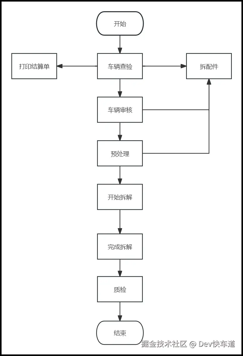 车辆拆解回收业务中,需要多个岗位配合完成车辆的拆解过程,主要流程如下图所示: