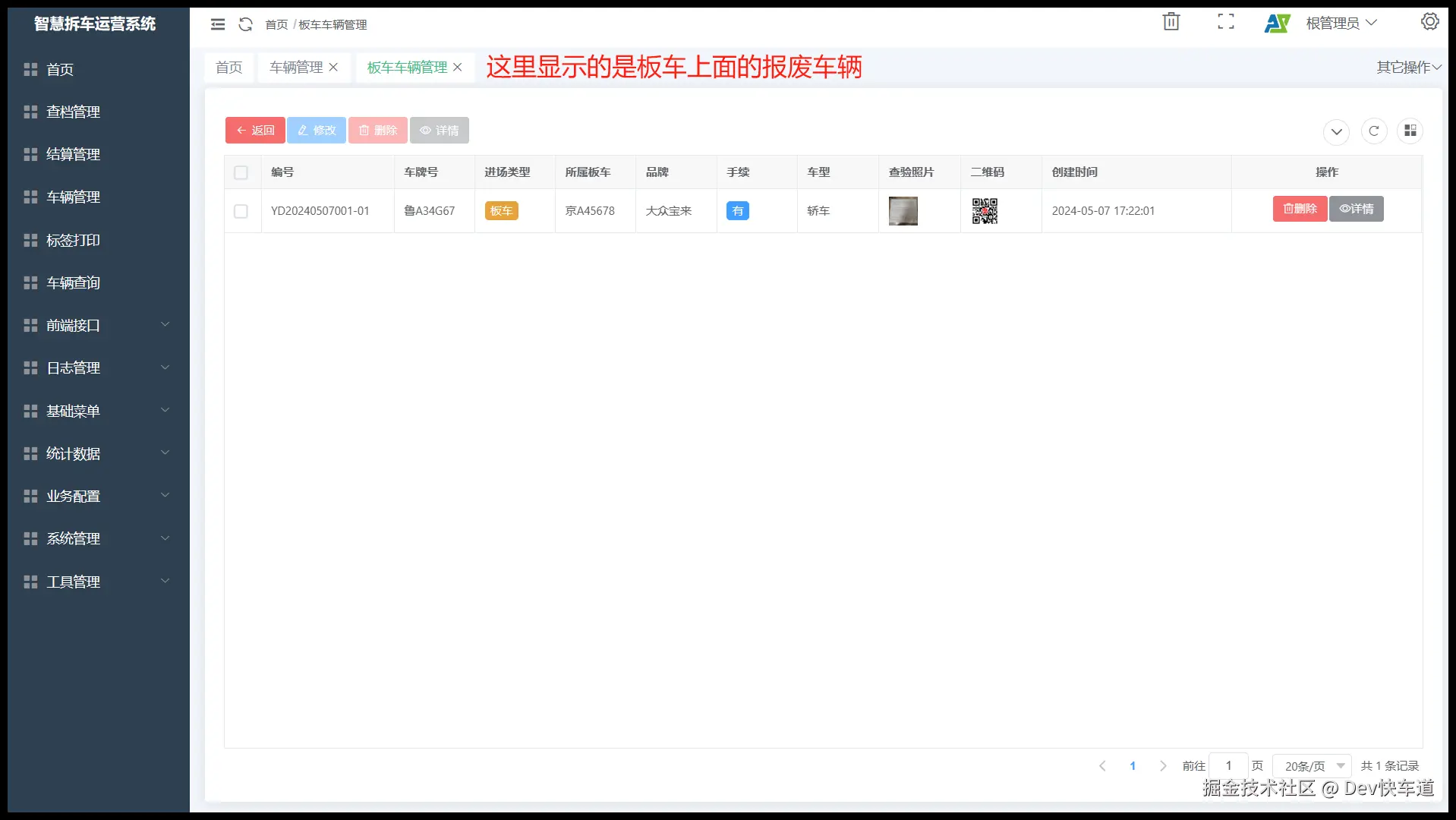 在车辆管理菜单中,显示的是单辆报废车和运输板车,如果需要查看某个运输板车上面的报废车辆,则需要点选运输板车, 然后点击所属车辆按钮,查看板车上面的报废车辆;