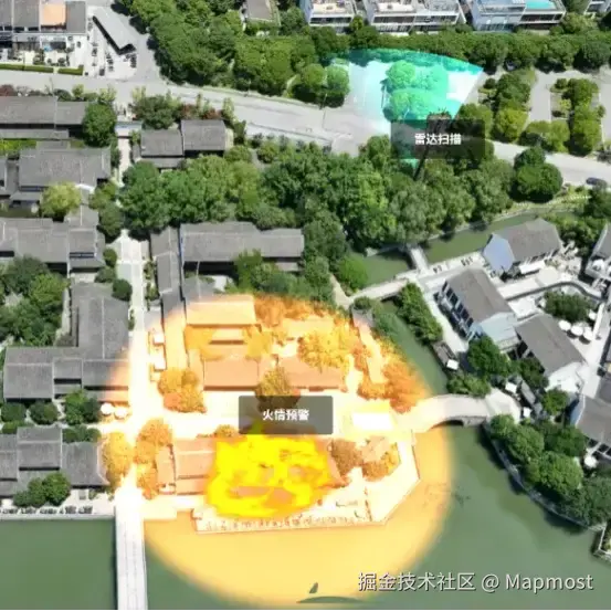 三维场景应用:支持多种动/静态图形要素在3DGS场景中的开发应用,以呈现数据分析或业务流程应用,包括:热力(2D、3D)、地理围栏、轨迹动画、视觉特效(火焰、特效球)、视角飞行等。