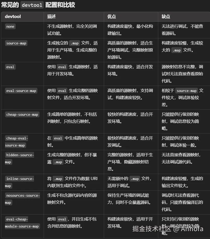 devtool,用于配置源映射(source maps),它影响代码在开发者工具中的调试体验和构建速度。不同的devtool配置有不同的性能和功能差异,主要影响调试时的精度、构建速度和最终的输出体积。