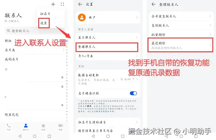 操作步骤:打开手机联系人应用设置,查找是否有【最近删除】或【恢复联系人】的功能,如果有,就可以直接还原丢失的数据。