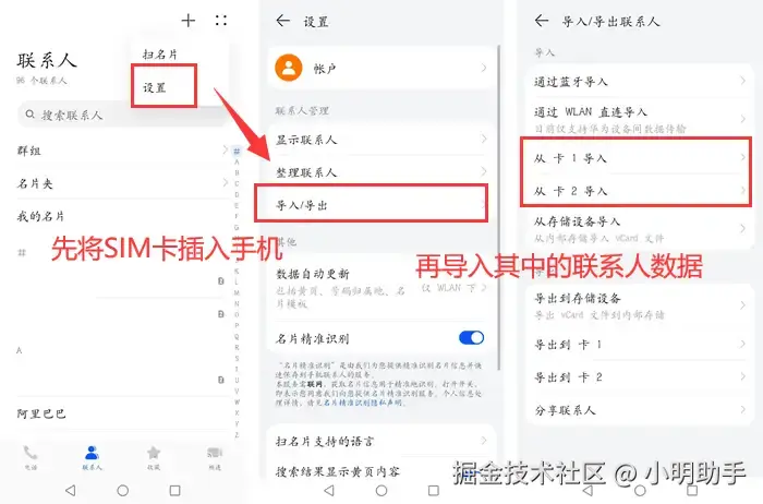 操作步骤: 把含有通讯录数据的SIM卡插入手机,然后在联系人设置中,选择【导入/导出】功能,将数据传输到手机中。