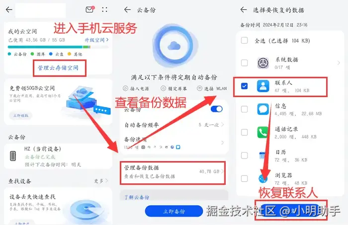 操作步骤: 进入手机云服务,查找已备份的数据,选择【联系人】>【恢复】,等待数据同步至手机本地。