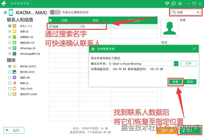 操作步骤2: 耐心等待一段时间,你的联系人结果就出来了。要是还记得该联系人的名字,那就使用搜索功能,精准定位。核对号码无误后,点击【导出】,确认要保存的位置,点击【恢复】就行!