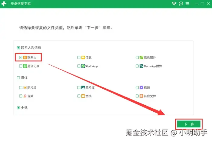 操作步骤1: 记得打开手机的USB调试模式,才能使用数据线连接到电脑。然后直接选择【联系人】>【下一步】,开启扫描!