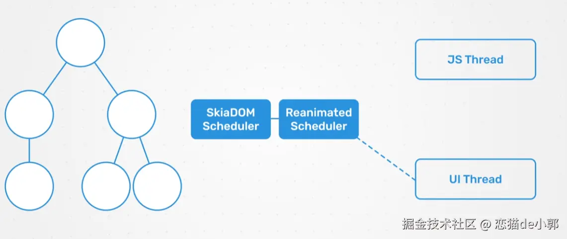 React Native Skia 并非简单地将 Skia 封装,它利用了 JSI (JavaScript Interface) 实现了 JS 与 Skia C++ 对象之间的直接和快速通信,同时 React Native Skia 与 Software Mansion 开发的 Reanimated 相互配合,让动画逻辑能够直接在 UI 线程上运行,保证了 Skia 动画的平滑和高性能渲染。