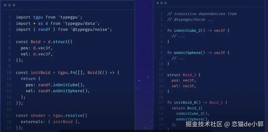 此外,由 Software Mansion 提出的 TypeGPU,作为一个类型安全的 WebGPU 支撑,目前是为了解决 WebGPU API 在某些方面(如 uniform byte alignment 和 padding)过于底层的问题,核心是提供一套类型安全的基元,桥接 TypeScript 和 WebGPU,从而允许在 JS 端创建类型化缓冲区并生成匹配的着色器代码,甚至允许 JS 函数在 GPU 上运行。