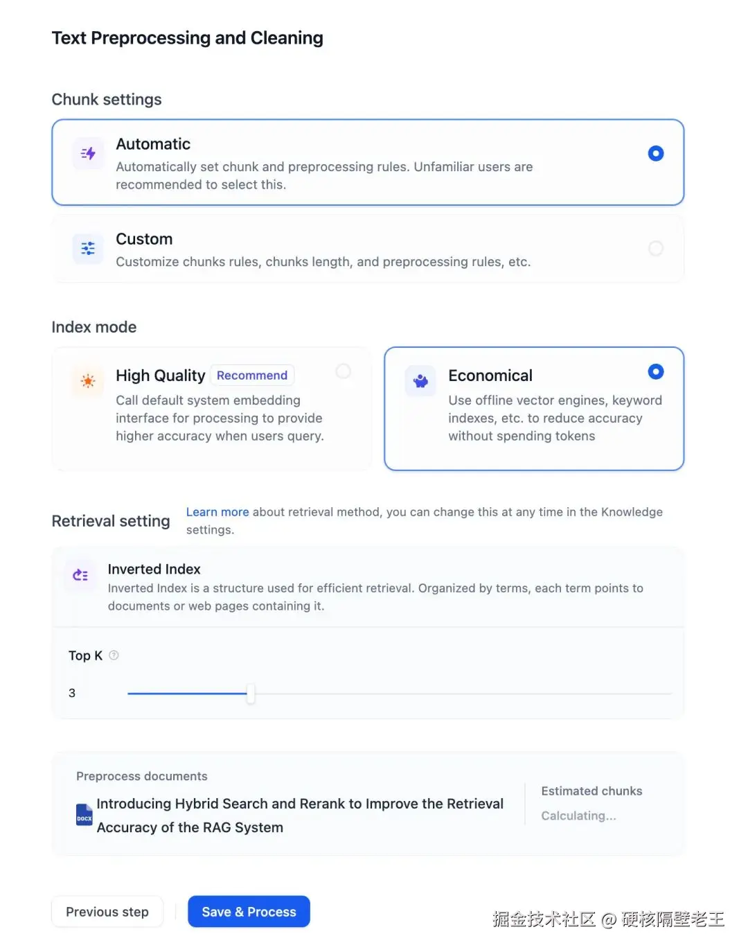 - 自动模式:Dify自动分割和清理内容,简化文档准备流程。