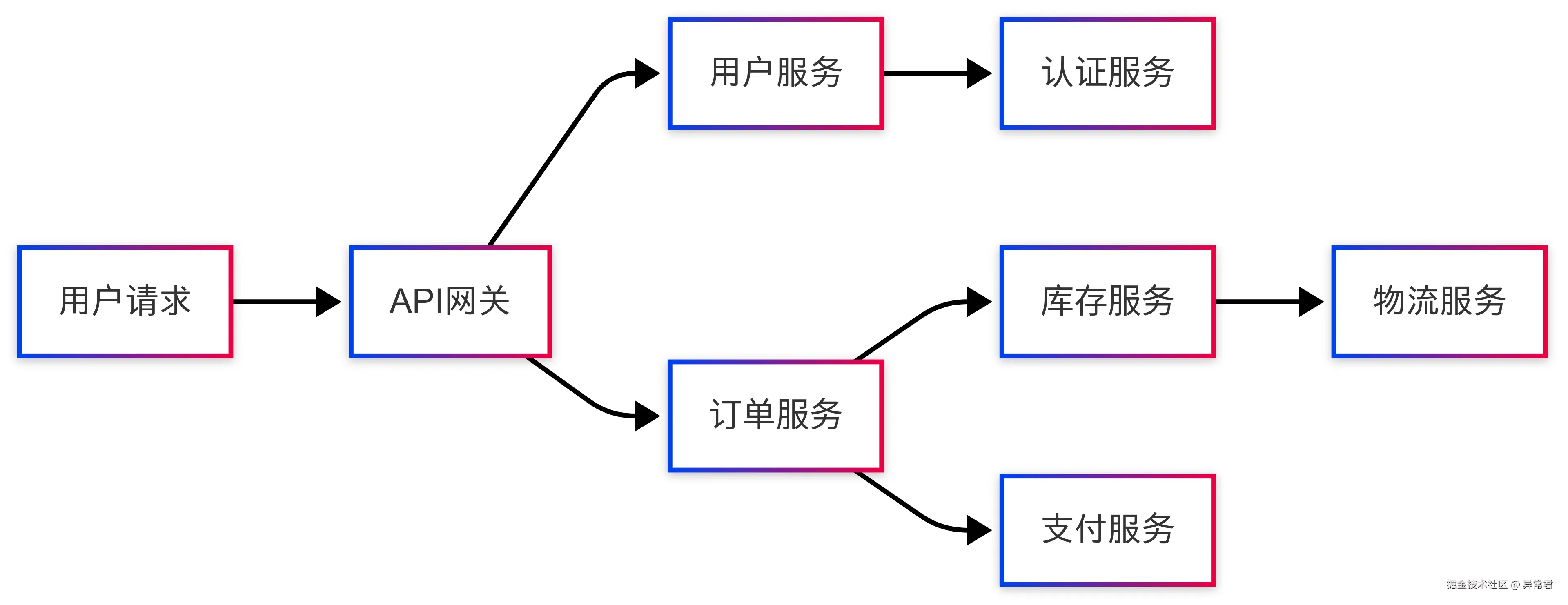 一个简单的用户请求可能需要经过多个服务协同处理,如下图所示: