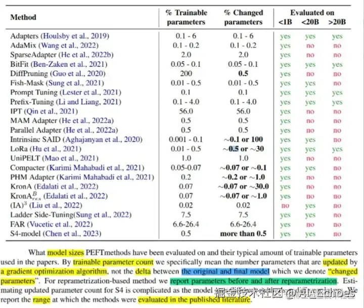 下表展示了各种参数高效方法的参与训练的参数量、最终模型与原始模型的改变参数(delta值)以及论文中参与评估的模型的范围(<1B、<20B、>20B)。