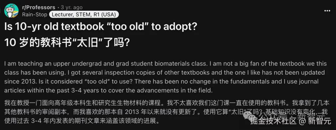 比如,这位网名 Rain-Stop 的生物材料教授称,虽然他喜欢的一本教材自从 2013 年就没有更新了,但是他使用过去 3-4 年内发表的期刊论文来涵盖领域内的进展。