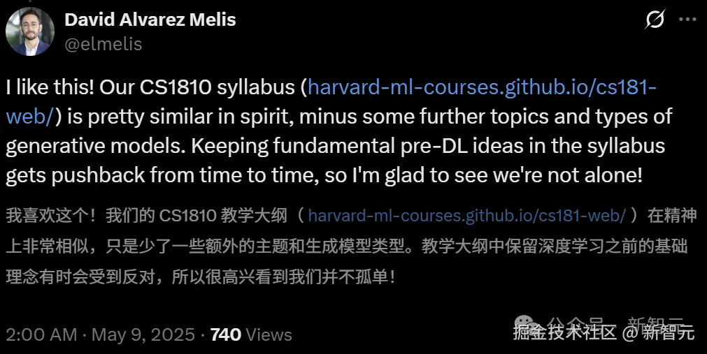 一位哈佛的助理教授说,自己非常喜欢这个教学大纲,和哈佛的 CS1810 课程大纲基本类似,只是少了一些进阶主题和生成模型的类型。