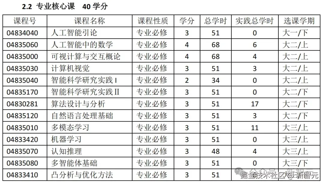 专业核心课中,包括人工智能引论、算法设计与分析、机器学习、多模态学习等。