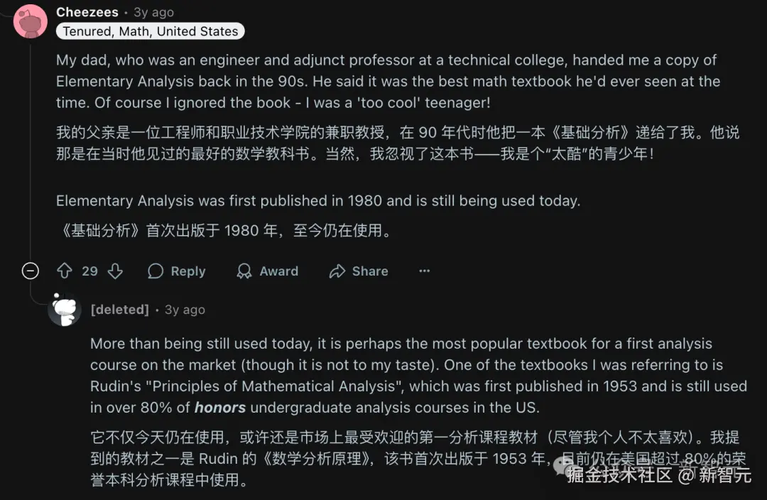 对此,reddit 上的网友 Cheezees 表示赞同,他说他的父亲——一名兼职教授,就认为《Elementary Analysis》是最好的数学教科书。这本书首版于 1980 年,但至今仍在使用。