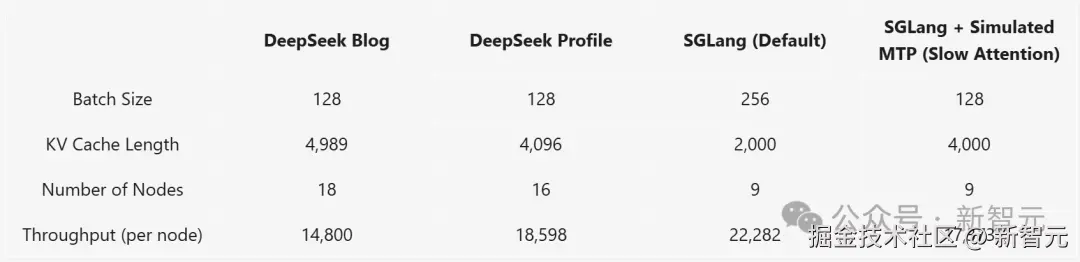 在使用 DeepSeek 一半数量的节点的情况下,搭载模拟 MTP 的 SGLang 仅比 DeepSeek 的性能分析数据略慢。