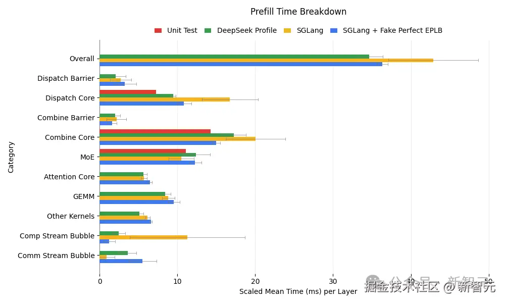 在默认的专家不平衡情况下,SGLang 的性能比 DeepSeek 的性能分析数据慢 20%;而在模拟的理想 EPLB 情况下,这个差距缩小到了 6%。