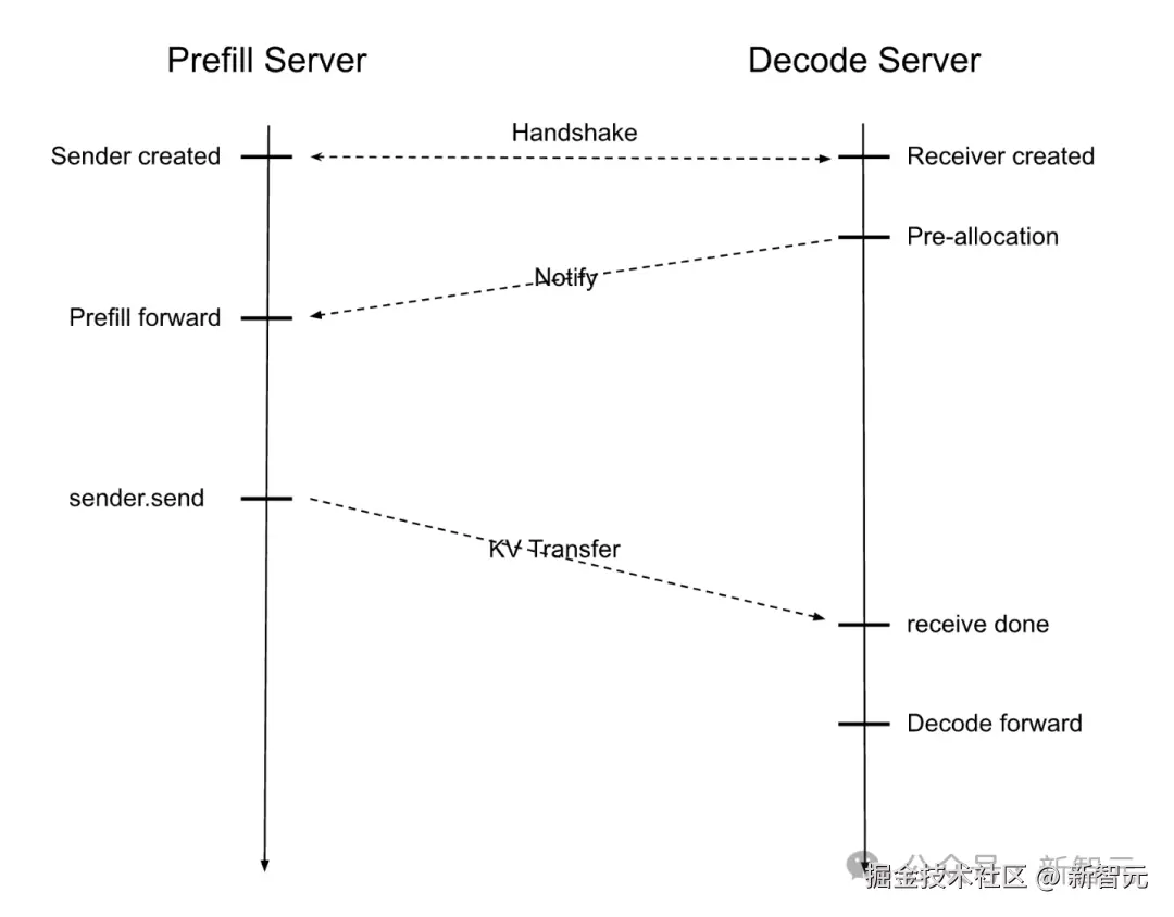 解码服务器预先分配 KV 缓存,并通知预填充服务器启动模型前向传递,计算 KV 缓存。