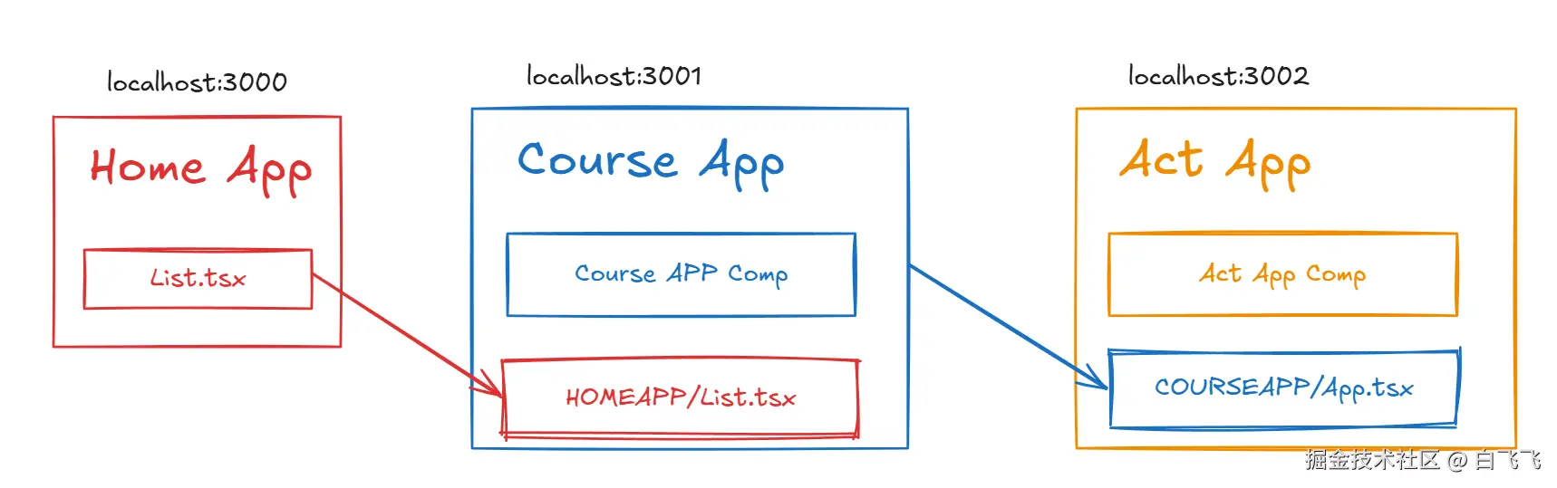 home-app:应用通过 Module Federation 暴露List.tsx组件;course-app:应用通过 Module Federation 加载/消费home-app/List.tsx组件,同时通过 Module Federation 暴露自身整个App.tsx应用;act-app:应用通过 Module Federation 加载/消费course-app/App.tsx整个应用。