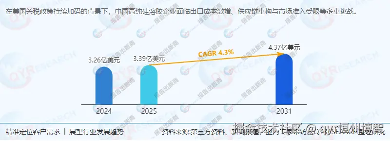 本报告基于QYResearch最新数据,聚焦美国关税政策对全球高纯硅溶胶行业的影响,从市场现状、供应链重构、技术竞争、区域机遇及未来趋势等维度展开分析。报告指出,2024年全球高纯硅溶胶市场规模达3.26亿美元,预计2031年增至4.37亿美元(CAGR 4.3%),中国企业在技术升级、市场多元化与区域协同中面临挑战与机遇。