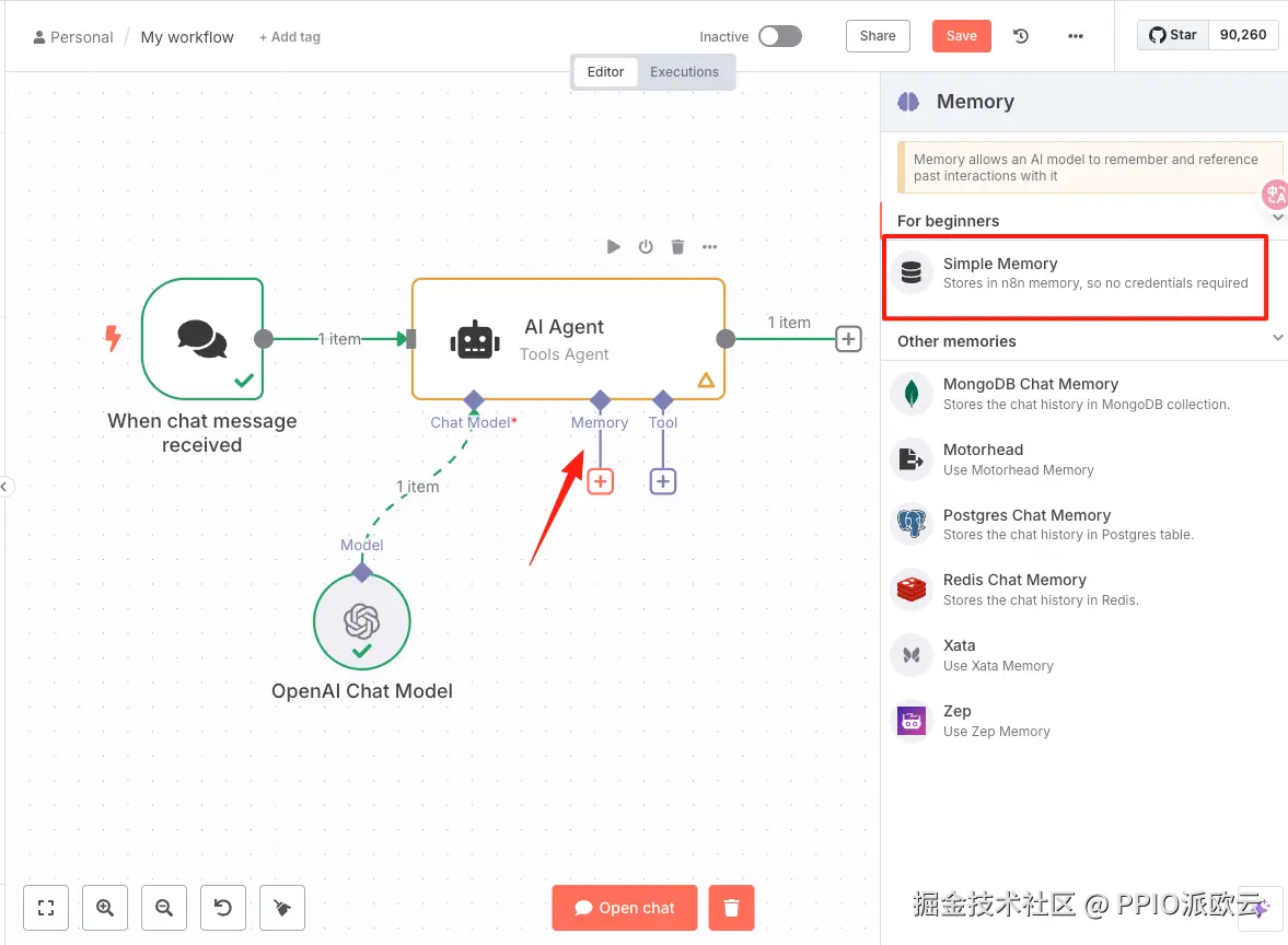 为了记住对话中发生的事情,AI Agent 需要保存上下文。我们可以通过在 AI Agent 节点中添加内存来实现这一点。