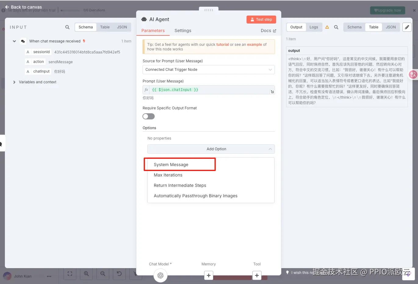 比如,聊天机器人默认的角色是一位“乐于助人的助手”,通过在AI Agent节点的“系统消息(System Message)”里设置,可以改变聊天机器人的初始设置,来实现不同风格的聊天。