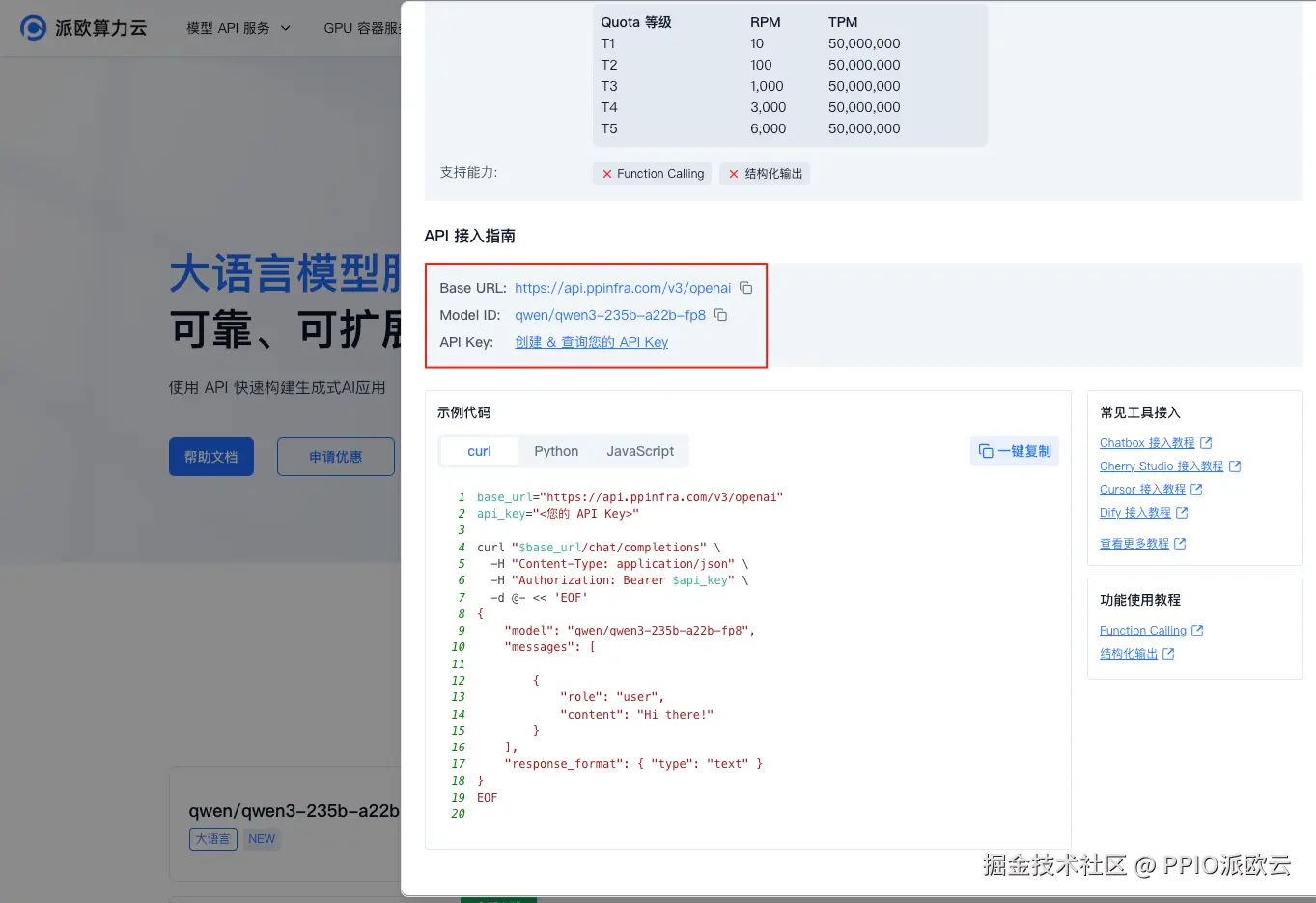 其中,Base URL 是 API 服务的根地址,API Key是用于身份验证和权限访问控制的密钥,Model ID 则是用于指定调用的具体模型资源。