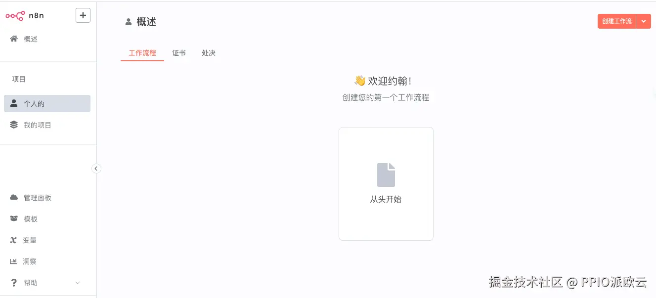 如果你是一个新用户,首先打开 n8n 网址 n8n.io 进行注册。注册完成后进入 n8n 的主界面,会看到一个空白的工作流;如果你是一个 n8n 老用户,可以直接创建一个新的工作流。