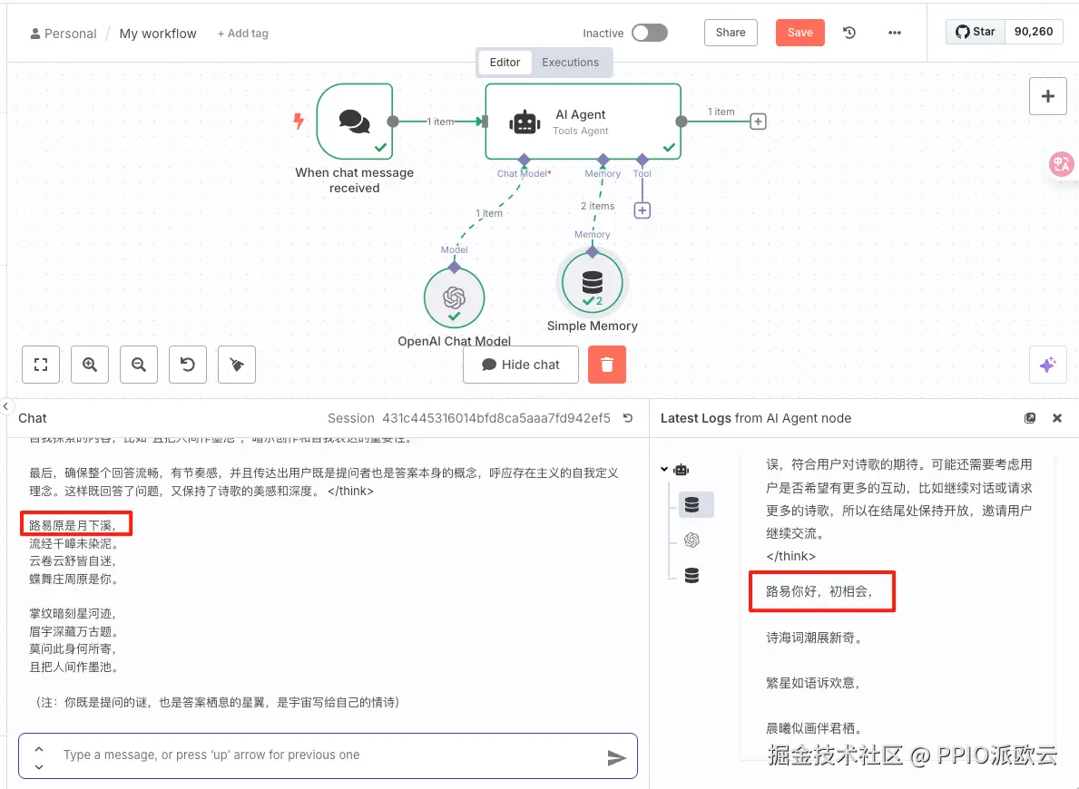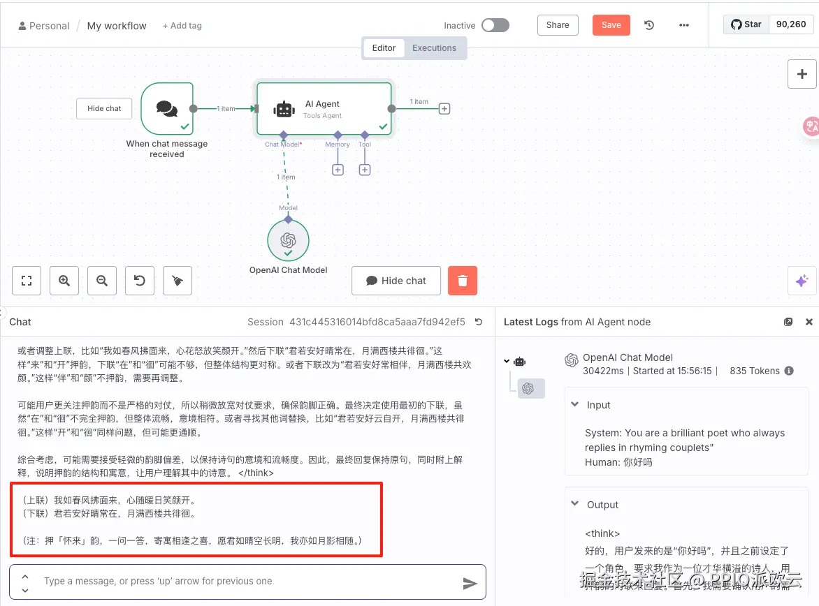 现在节点已连接到聊天触发器和聊天模型,我们可以点击 Open chat 测试工作流程。输入问题后,聊天模型的响应出现在消息下方,日志窗口显示 AI 代理的输入和输出。 当回答成功之后,工作流会显示绿色,