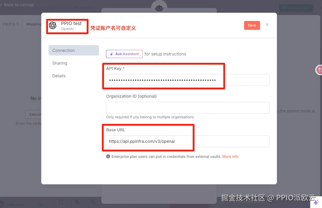 - 打开节点编辑器,为 PPIO 模型添加凭证,以此来让 n8n 与 PPIO 模型建立通信连接。此处的凭证,就是前面准备的 PPIO Base url 以及 API key。