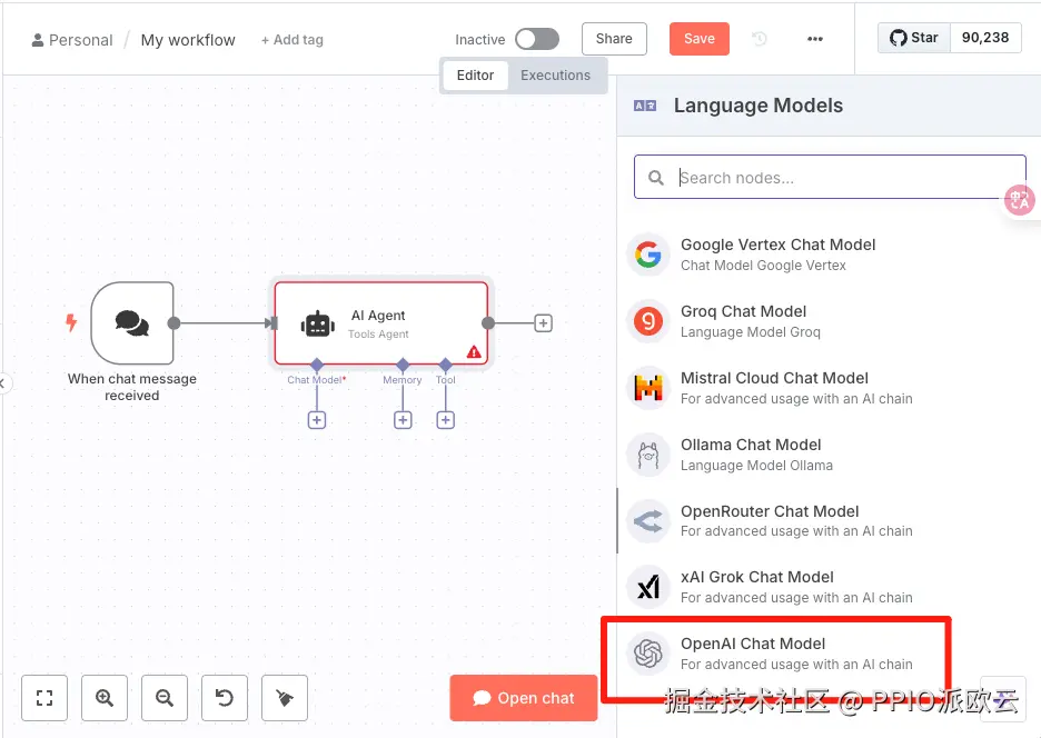 - 单击 AI 代理节点上的聊天模型的加号添加聊天模型。随即会出现“语言模型”的搜索对话框。这些是 n8n 内置支持的大模型。我们拉到最下方,选择 OpenAI Chat Model,以此来添加 PPIO 的模型(跟OpenAI API 协议兼容)。