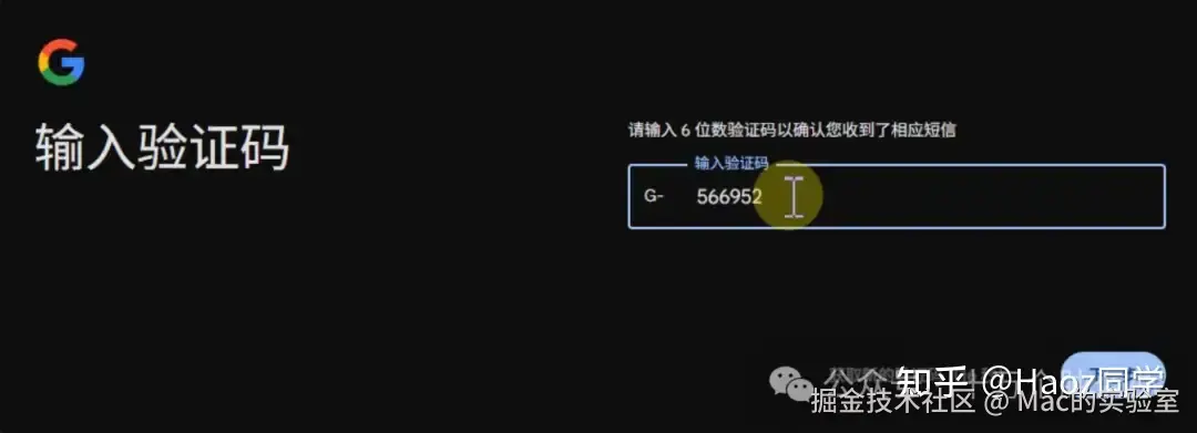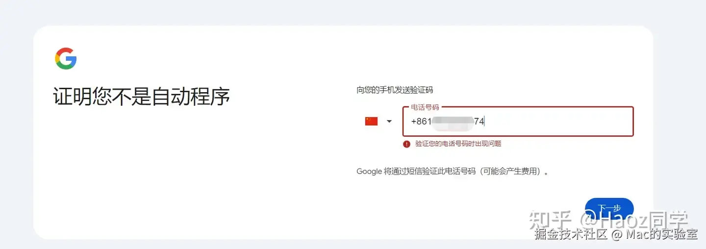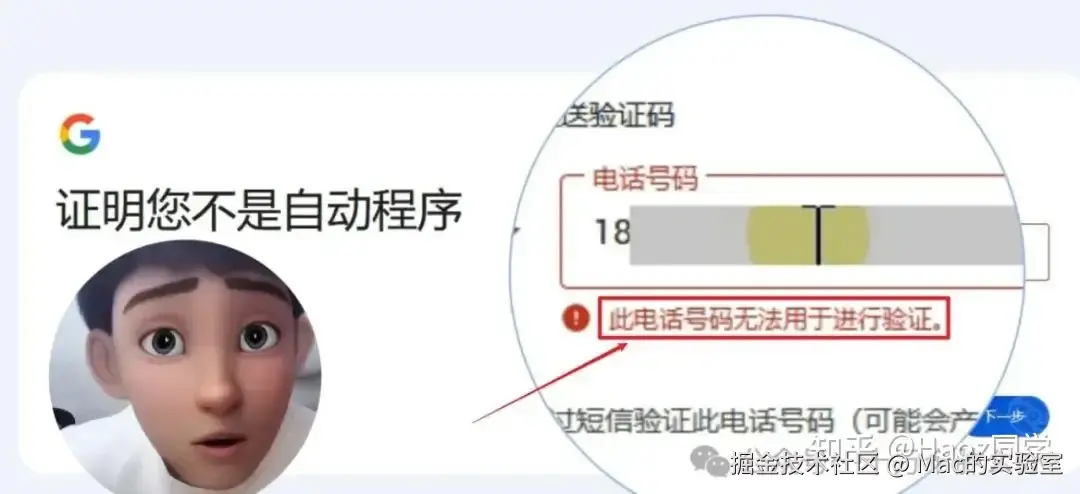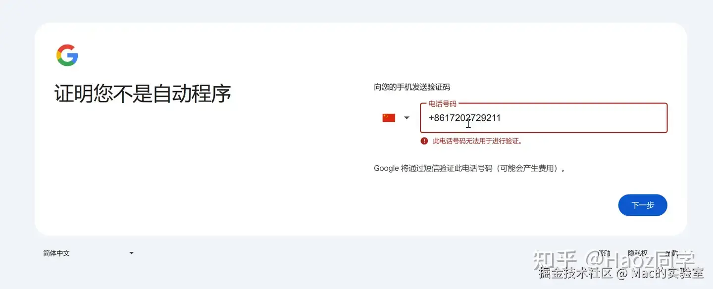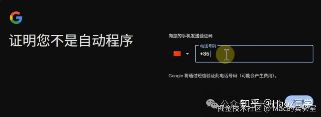 PS: 如果你遇到这一步还是无法通过手机号验证,说明你的代理dns并不干净,所以谷歌会拒绝注册,解决方法可以在公众号:Mac的实验室 后台回复 谷歌 几分钟就搞定了