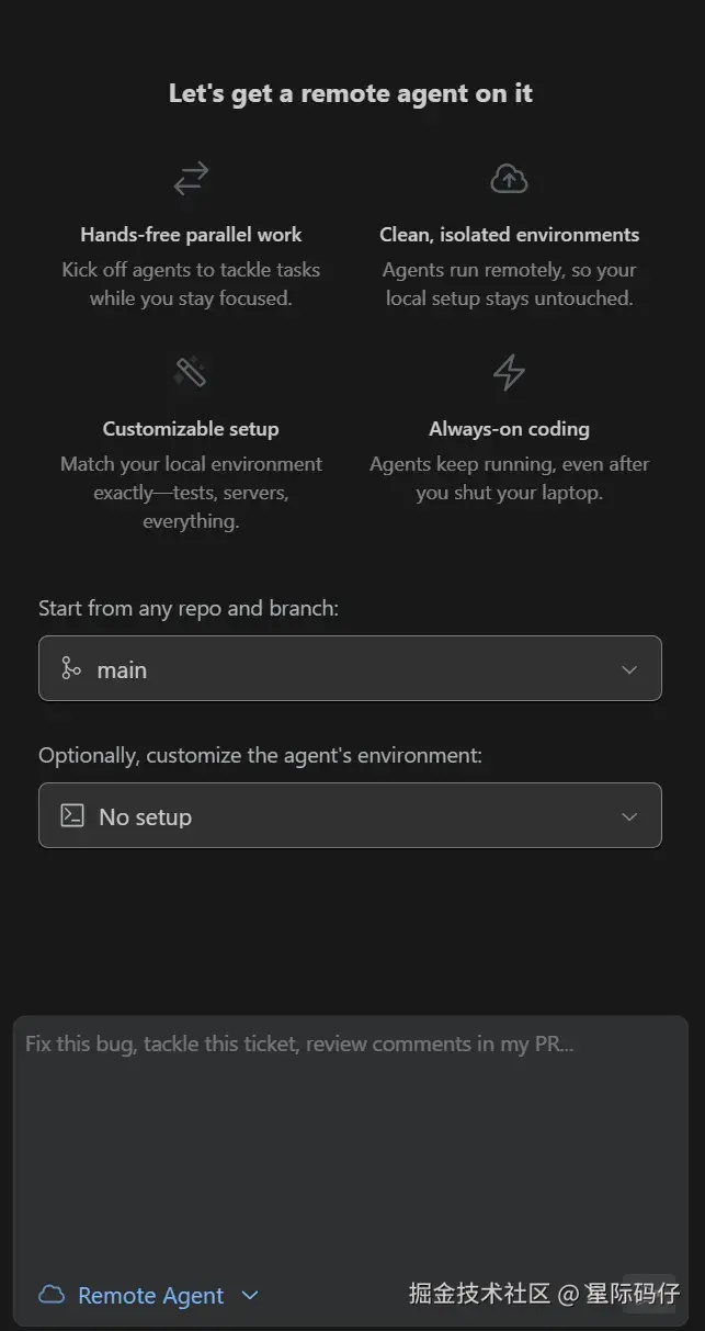 - 开发者可以将那些积压已久、相对琐碎但又必须解决的技术问题(例如:“让 Agent 帮忙更新过时的项目文档”、“修复那些偶尔失败的自动化测试用例”),交给 Remote Agent 处理。任务完成后,开发者只需审查其提交的 Pull Request,从而有效减轻维护负担。