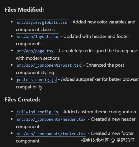 - 清晰的文件变更列表:明确展示了哪些文件被修改、添加或删除了。