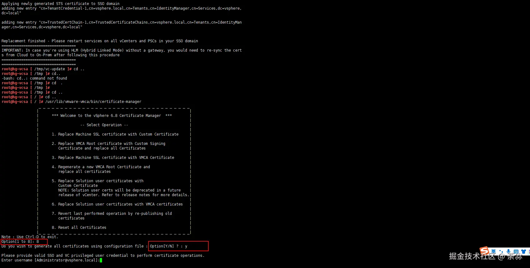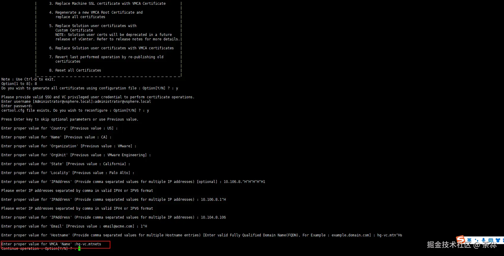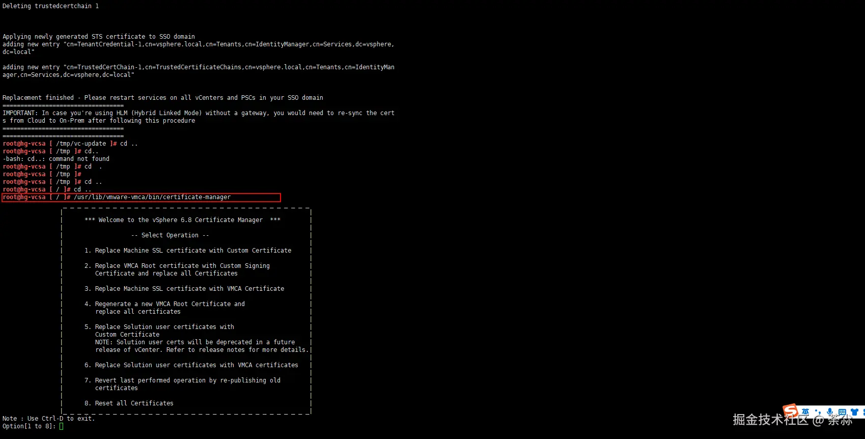 使用xshell连接进入vc,输入命令/usr/lib/vmware-vmca/bin/certificate-manager回车开始更新