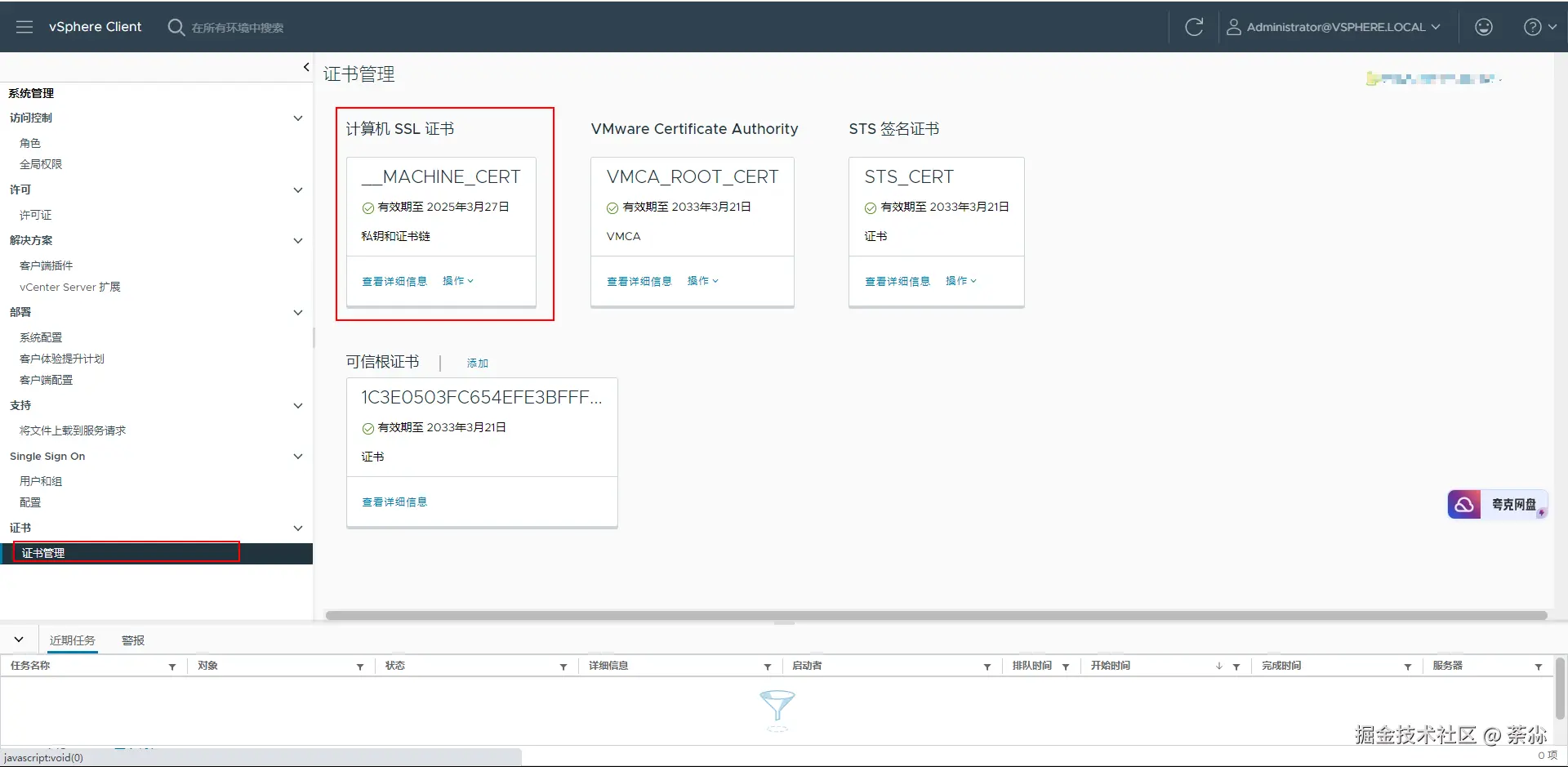 VMware vCenter Server 使管理员能够从一个位置深入了解虚拟基础架构的集群、主机、虚拟机、存储、客户操作系统和其他关键组件等所有信息。它的作用也是十分的重要,所以为了保证 VMware vCenter Server的正常运行,需要记住证书的过期时间,可以在系统管理下的证书管理中检查过期时间。