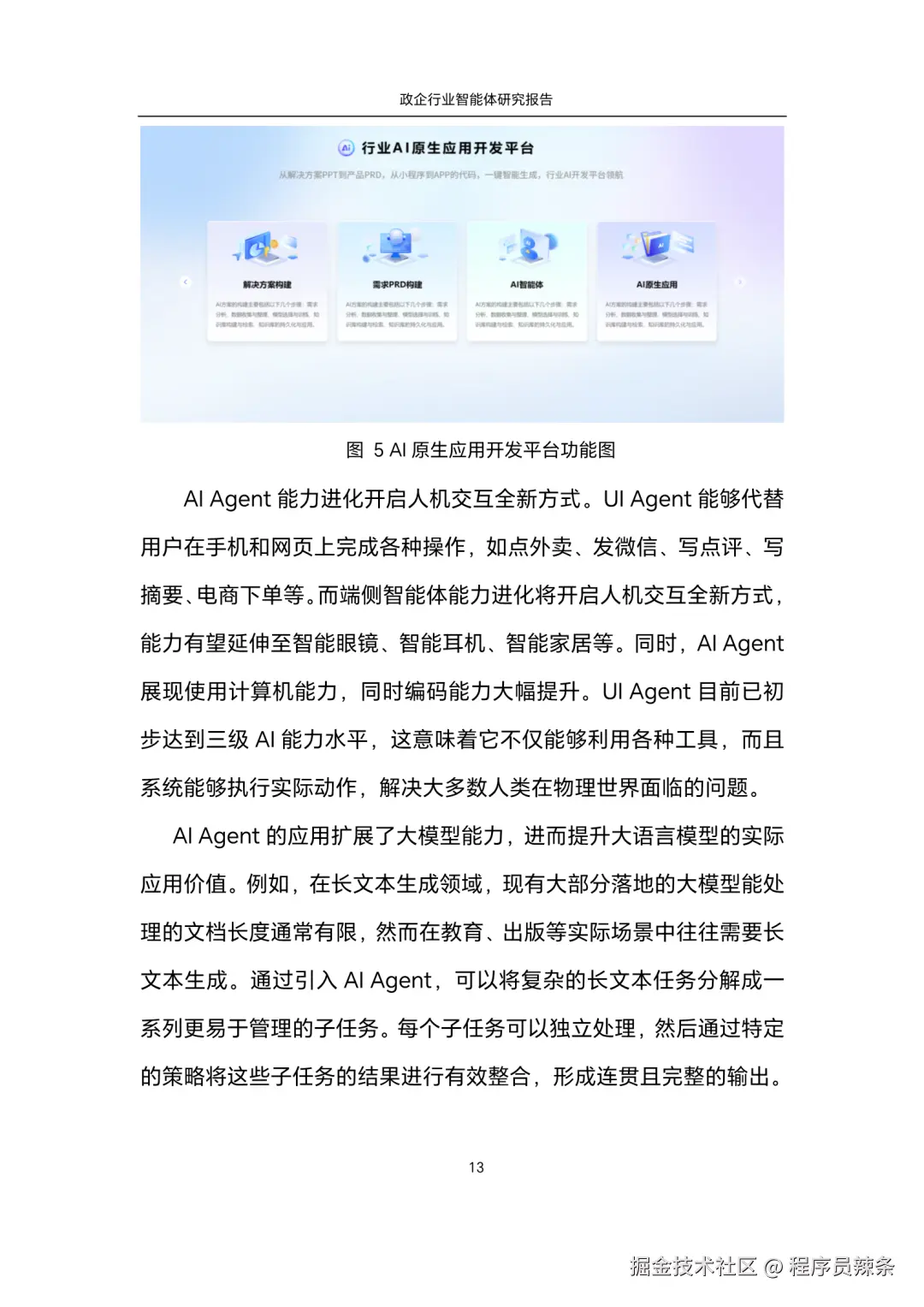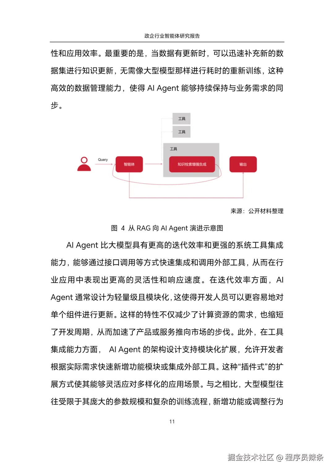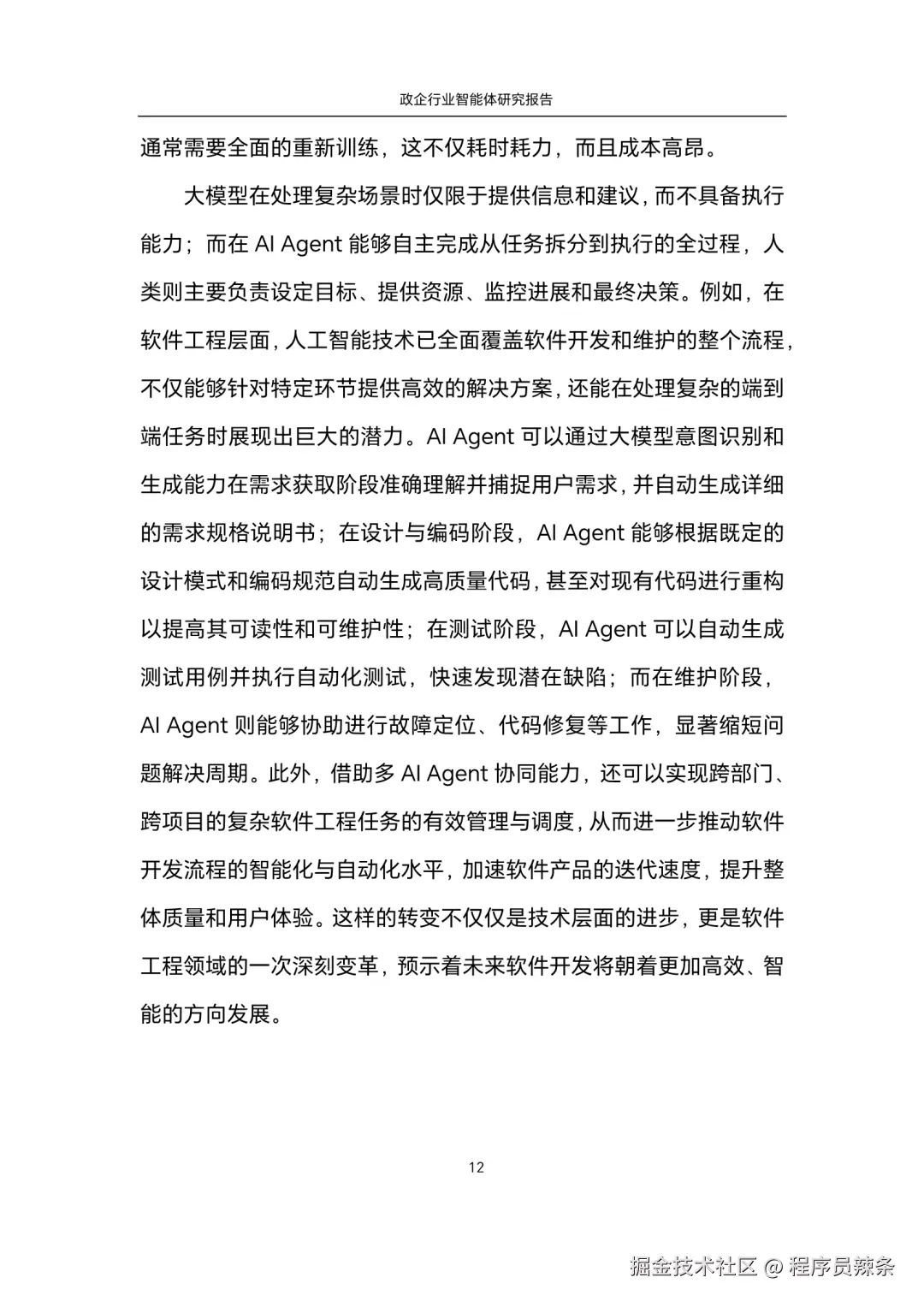 本文主要介绍了政企行业AI Agent的发展现状、技术架构、应用案例、评价体系以及面临的挑战和解决思路。文章指出,AI Agent已成为大模型技术落地应用的关键途径,能够高效吸收新信息,确保系统与业务持续同步。政企行业AI Agent总体框架包括底座层、构建层、应用层和价值层,技术架构则分为模型层、能力层、平台层和应用服务层。文章还列举了政务、教育、文宣、住建、工业等多个领域的应用案例,展示了AI Agent在提升服务效率、增强核心竞争力方面的价值。此外,文章还提出了政企行业AI Agent的评价体系,包括关键技术评价指标和平台评价指标,以及大规模应用面临的挑战和解决思路。