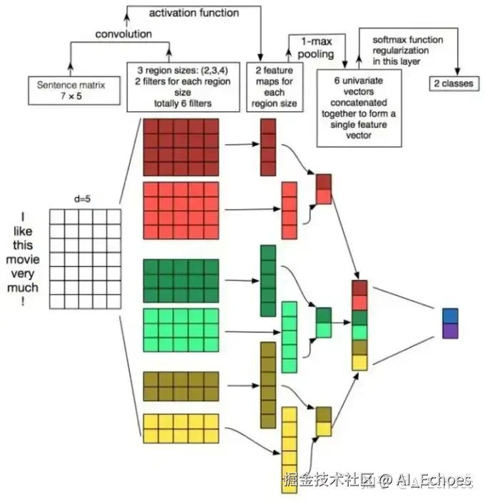 第一层为输入层。将最左边的7乘5的句子矩阵,每行是词向量,维度=5,这个可以类比为图像中 的原始像素点了。