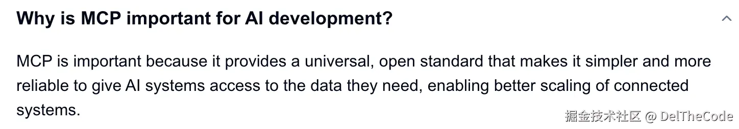 MCP很重要是因为它提供了一个通用的开放标准,使人工智能系统访问所需数据变得更简单、更可靠,从而能够更好地扩展连接系统。