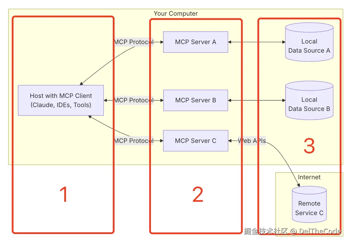 第三部分是既有的东西,可以是内部的数据源、也可以是公网上的某些远端服务,它们与MCP Server如何连接呢?答案是可以任何方式,比如web api\数据库连接访问\FTP等