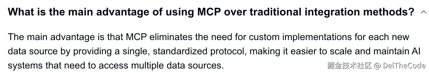 主要优势是 MCP 通过提供单一、标准化的协议消除了为每个新数据源进行自定义实现的需要,从而更容易扩展和维护需要访问多个数据源的 AI 系统。