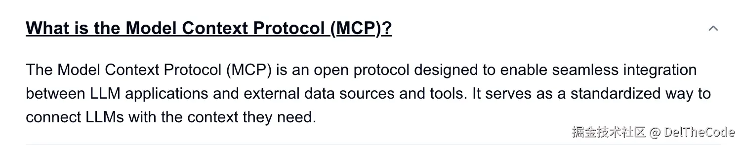 上面问题的回答重复性很高,总结来说,MCP就是由Anthropic公司提出的一套用来实现LLM与外部数据源和工具之间的标准化通讯方式,使得LLM可以与用户需要的上下文信息连接起来